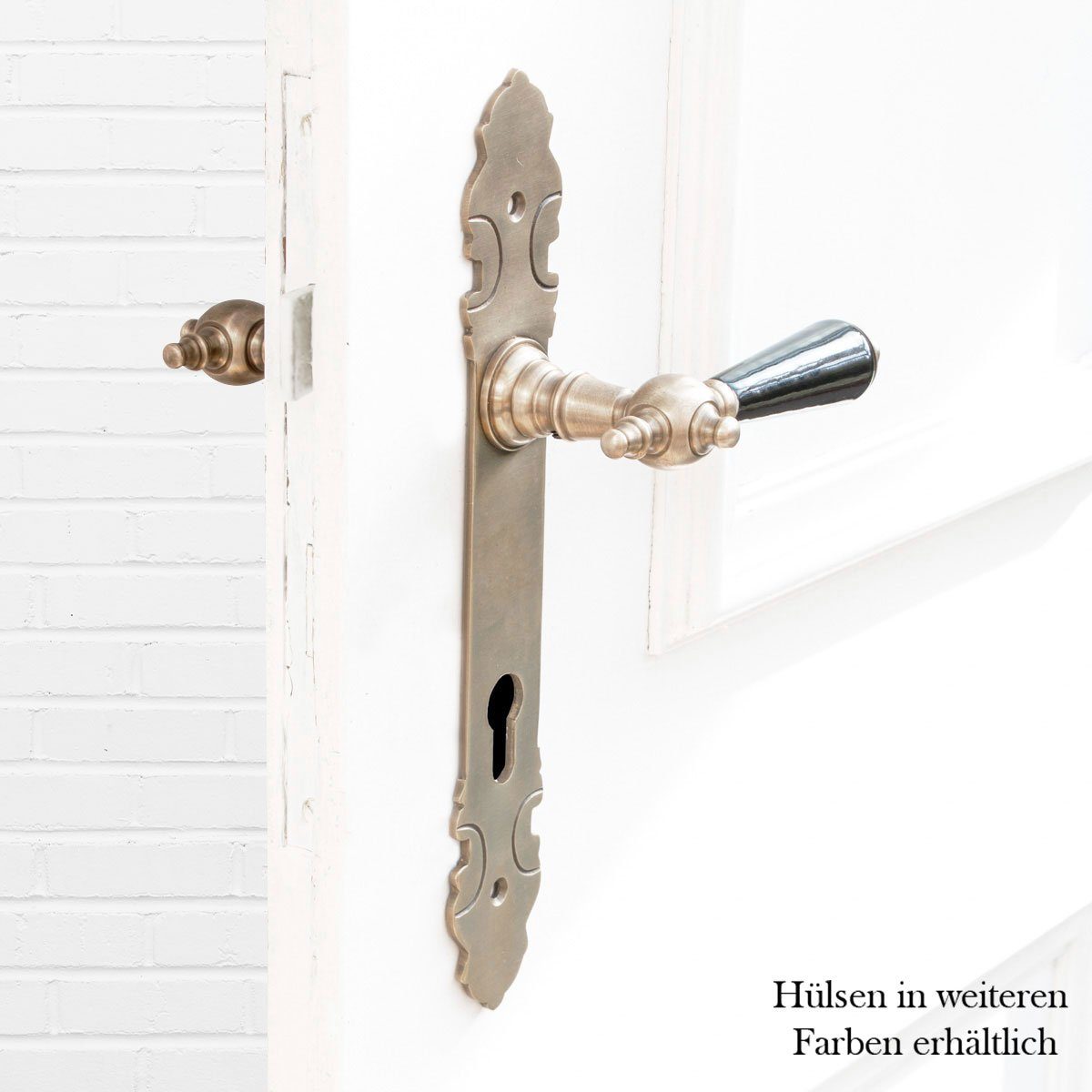 Lieferumfang: 1 Drückergarnitur: 2 x Türklinke mit Porzellangriffen in schwarz, 2 Langschilder, Messing patiniert, PZ92 inkl. Dorn, 8 x 8 mm, 10 cm