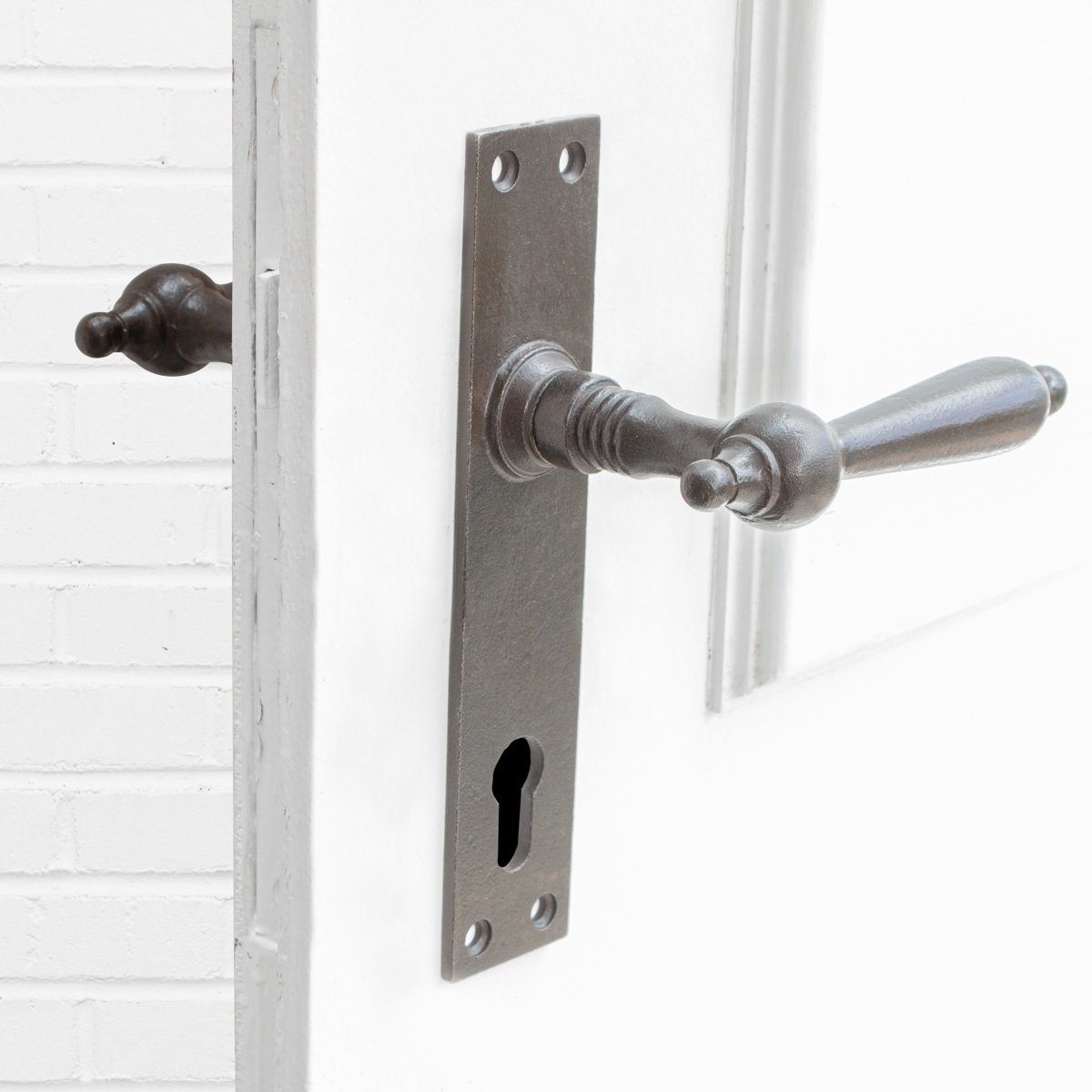 Diese Drückergarnitur ist wie zu historischer Zeit gewachst und ausgestattet mit schlichten Langschildern, welche über ein genügend großes Schlüsseloch verfügen, damit Sie einen modernen Schließzylinder einbauen können.