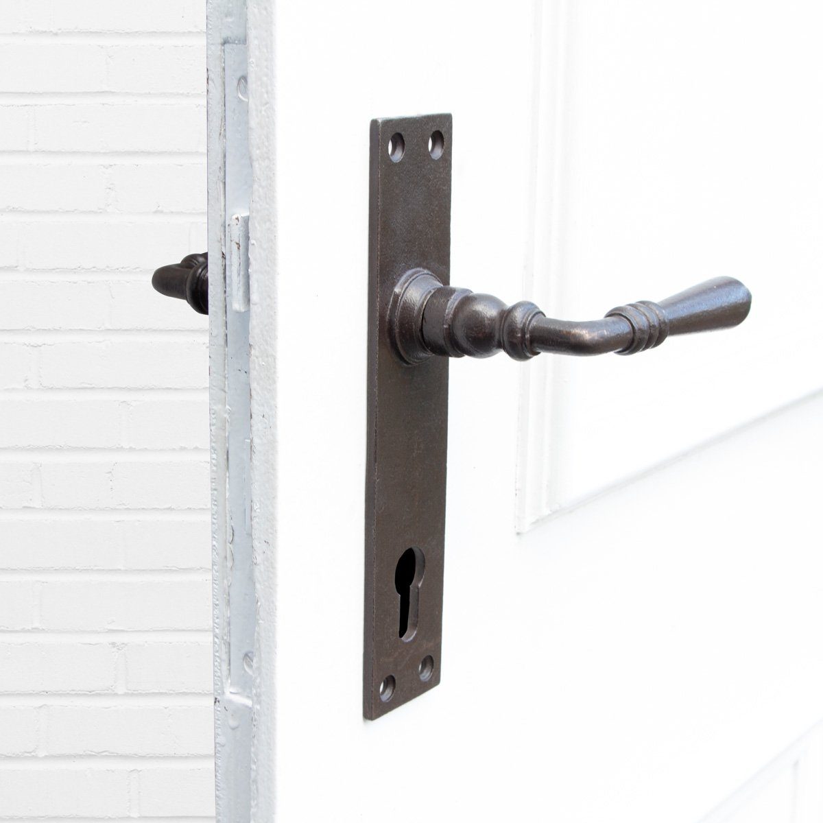 Lieferumfang: 1 Drückergarnitur Eisen, einschliesslich Dorn 8 x 8 cm, 2 Klinken Kate mit 2 Langschildern Cavo, Eisen gewachst, Außentür (PZ92)