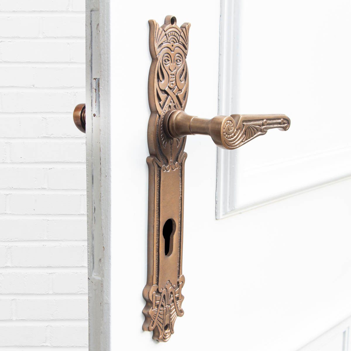 Die hübsche Drückergarnitur mit Türklinken und zwei passende Langschilder sehen aus wie original Antik und können für historische Renovierung genutzt werden. Die Klinken-Garnitur aus Messing wurde nach einem jugendstilistischen Original gefertigt. Antik-romantische Gestaltung gepaart mit der neusten Entwicklungstechnologie und dem besten Material welches stetiger Kontrolle unterzogen ist, machen diese Komponenten so unvergleichlich.