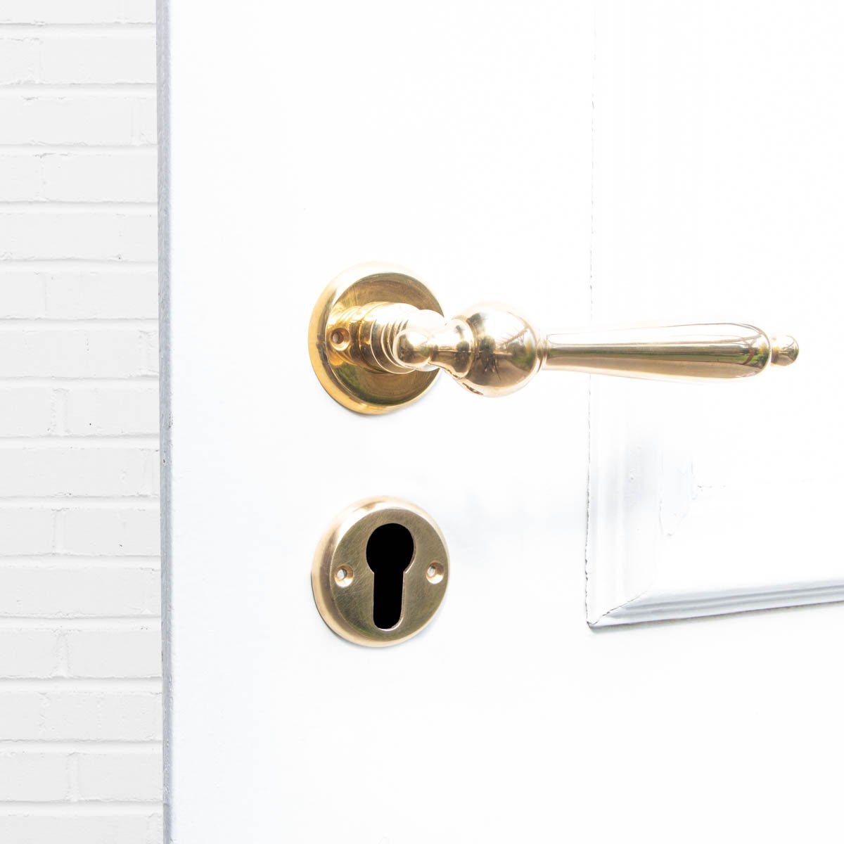 Diese Drückergarnitur ist ausgestattet mit runden Rosetten. Всіs ist aus hochwertigem massiven Messing gefertigt. Die Schloss-Rosetten sind für die heutige Zeit mit einer passend großen PZ-Öffnung für ein modernes Zylinderschloss versehen.