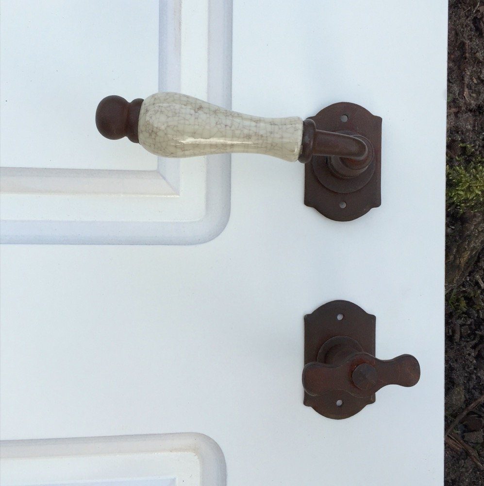 Die Porzellan-Farbe dieser Türklinkengriffe ist altweiß Krakelee.