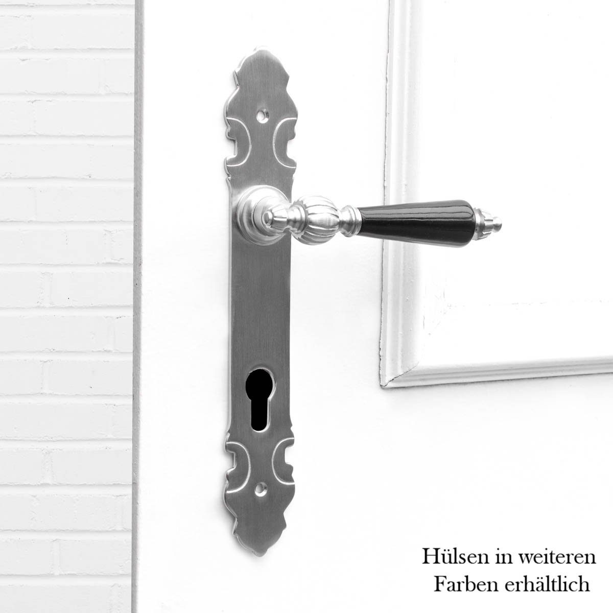 Diese stilvolle Garnitur besteht aus einem ansprechend gestalteten Langschild und dem dazu passenden Klinkenpaar mit besonders fein erscheinenden Porzellan Griffen. Die schön geformten, griffgeschmeidigen Türklinken, welche nach einem antiken Original hochwertig nachgefertigt wurden, sind die ideale Ergänzung für Ihre historische Eingangstür. So ist diese Haustürgarnitur bestens für die Denkmalpflege zu verwenden - ebenso schmückt sie jedoch auch die moderne, individuell gearbeitete Tür und unterstreicht das Bild eines besonderen Wohn-Ambientes.