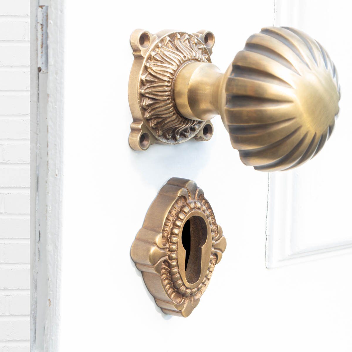 Ein besonderer Türbeschlag mit Diebstahl-Schutz: Die Sicherheits - Schloss-Rosette für das Zxlinderschloss besteht aus zwei Teilen und lässt sich von Aussen nicht abschrauben. Wie aus der Gründerzeit erscheint diese tolle Sicherheits- Türknauf-Kombination. Всі Teile sind aus hochwertigem Messing gefertigt.