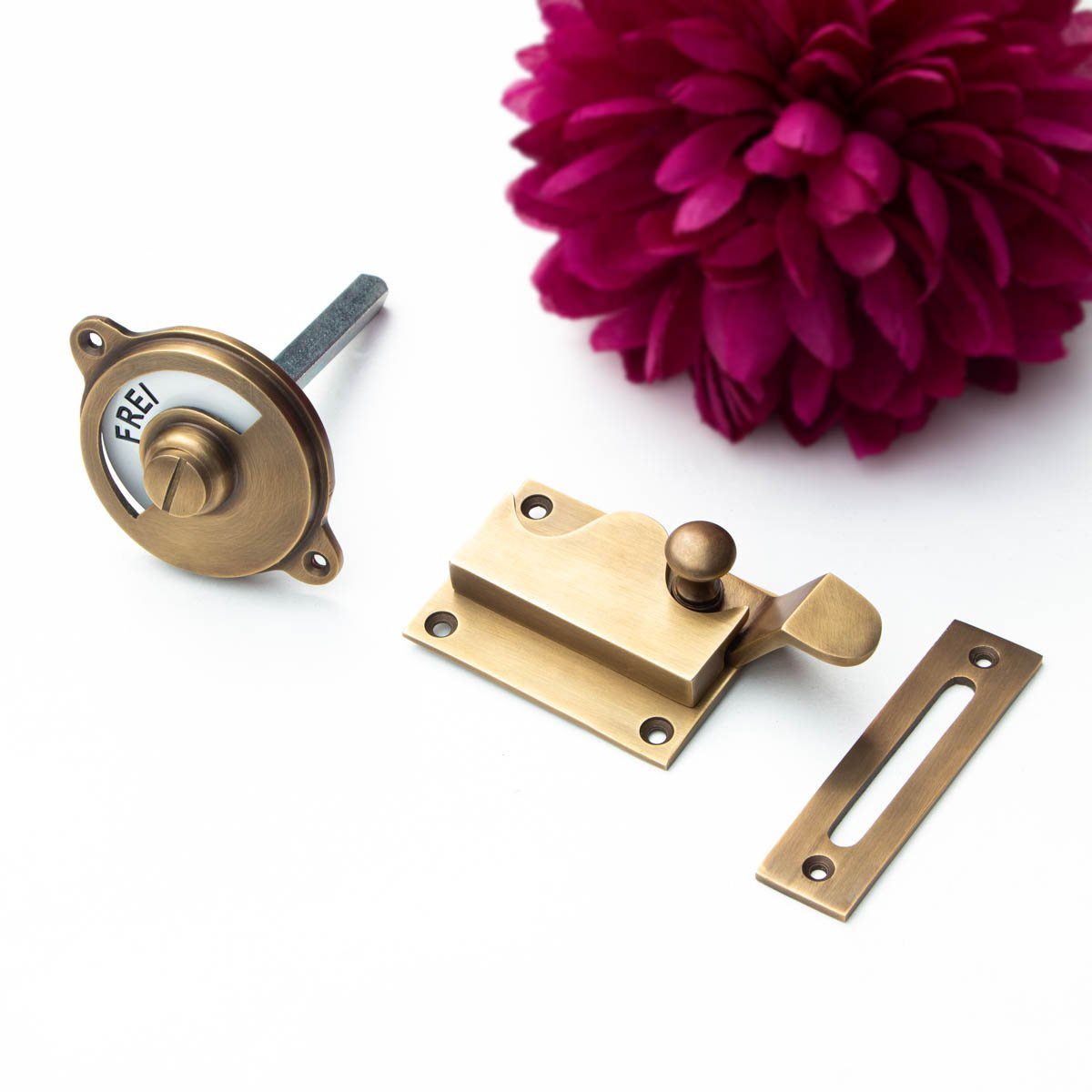 Ein besonders schön gearbeiteter Toilettenverschluss - wie antik. Nach historischem Original in Messing patinier gefertigt! Dieser, wie auch unsere weiteren Türbeschläge sind in sehr perfekter und hochwertiger Ausführung gearbeitet!