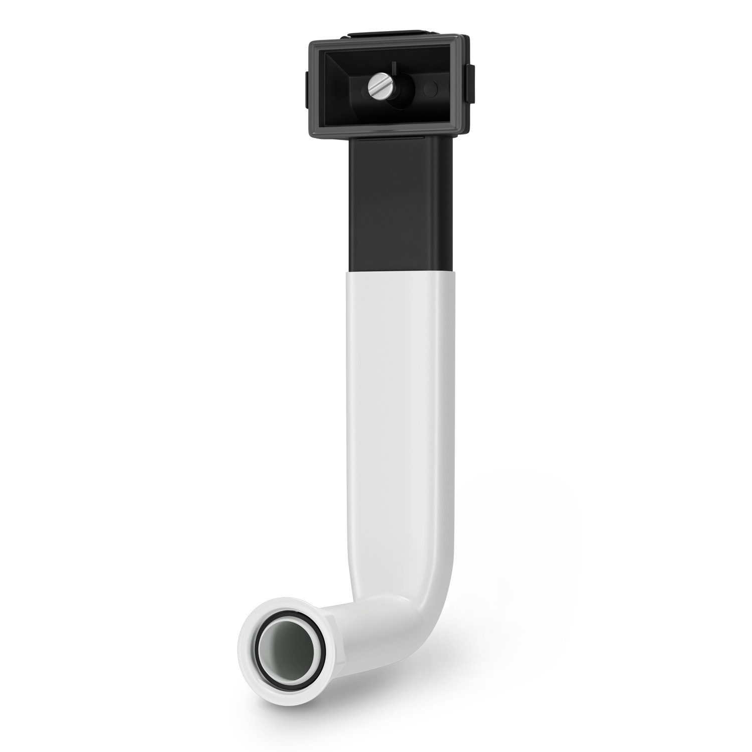 Diese Überlaufgarnitur besteht aus 2 Teilen: schwarzer Spülen-Überlaufanschluss und weißes, starres Winkelrohr. Eine passende Dichtung gehört zum Lieferumfang