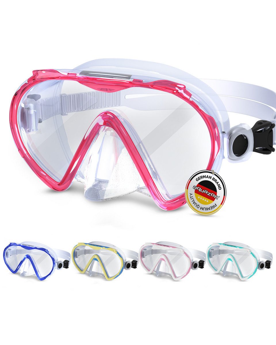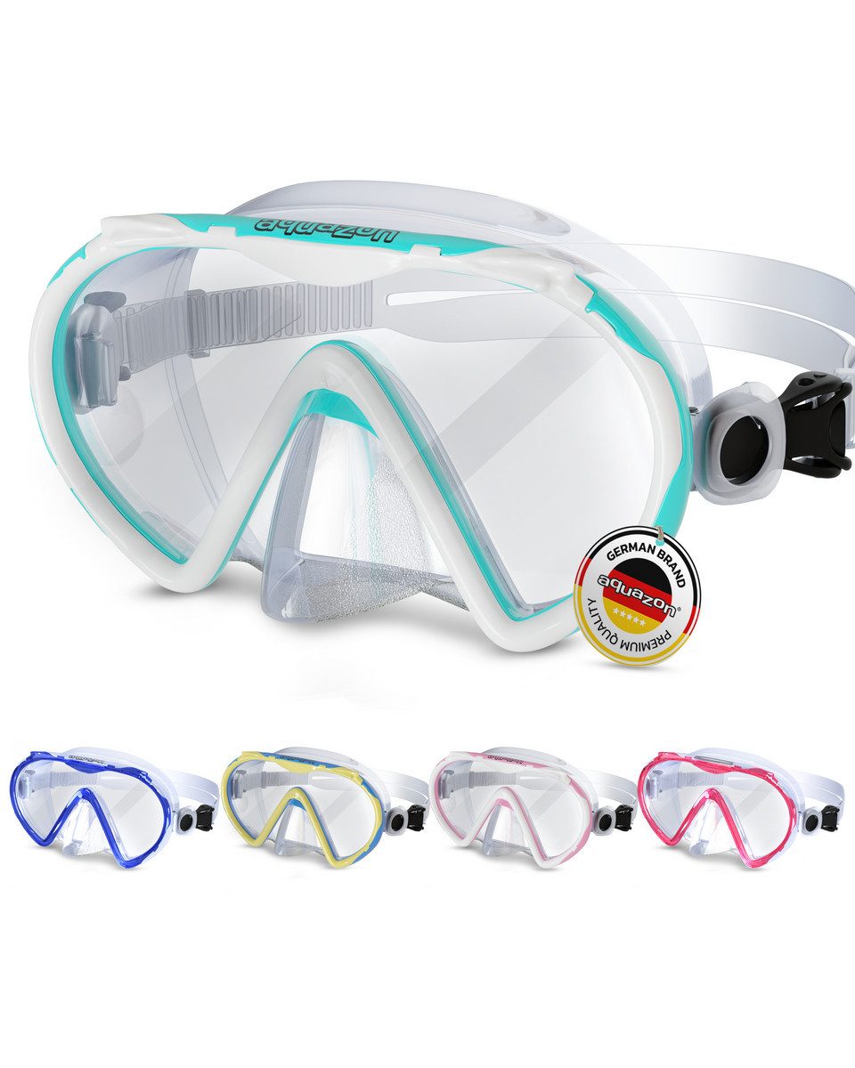 Die Brille glänzt mit einer Echt-Glasscheibe und einem anti Fog - anti Beschlag System (Temperiertes Glas, tempered glass). Der Maskenkörper und das Maskenband der Tauchermaske sind aus elastischem, anpassungsfähigem Silikon gefertigt. Das garantiert eine sehr gute Passform und eine hervorragende Abdichtung. Das WIDE VIEW Design der Maske sorgt für eine sehr großes Blickfeld, die Brille ist sehr vielangenehmer zu tragen als eine Vollmaske. Sehr praktisch ist das QUICK REALEASE Verstellsystem des Maskenbandes. So gelingt das anpassen an den Kopf spielend leicht. Als Schnorchelset mit Schnorchel ist diese Brille auch zu erhalten unter der Bezeichnung AQUAZON Korfu. Sie ist auch gut zu kombinieren mit unseren AQUAZON Flossen. AQUAZON Beach ist die ideale Tauchmaske für Kinder, Jugendliche und Erwachsene, Damen und Herren zum Schwimmen, Baden und schnorcheln. Selbstverständlich versandkostenfrei und superschnell bei Ihnen!