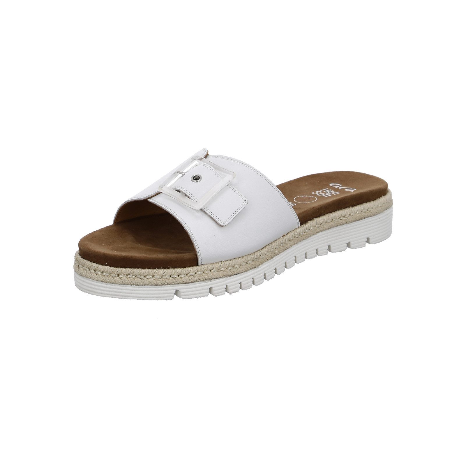Diese Pantoletten von ara mit besonders weichem Obermaterial lassen Frauenherzen höherschlagen! Das fest eingearbeitete Fußbett ist aus weichem Leder und bequem gepolstert und schmiegt sich wunderbar an den Fuß an. Die innovative HighSoft Technologie tut ihr Übriges und garantiert moosweichen Auftritt und ermüdungsfreies Gehen dank der dämpfenden Wirkung. Mit ihrem stylischen Design und der geflochtenen Bastoptik rund um die Sohle lassen sich die Pantoletten hervorragend zu einem Sommerkleid tragen. Durch die Schnalle lässt sich der breite Riemen perfekt an Ihren Fuß anpassen. Guten Halt bietet die rutschhemmende Sohle. Ob beim Treffen mit Freunden oder beim Stadtbummel, diese Pantoletten sind die idealen Begleiter für die Freizeit.