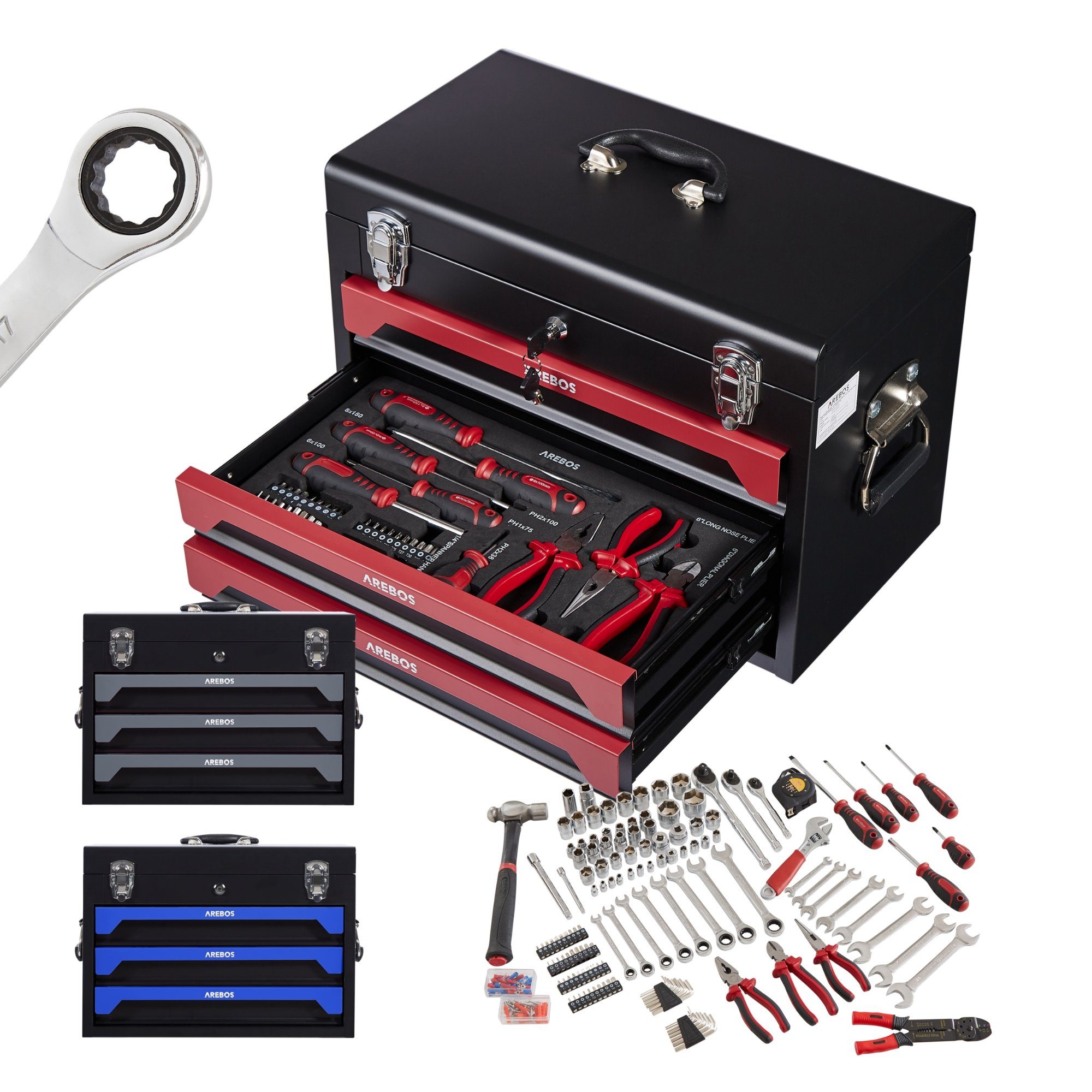 Der AREBOS Werkzeugkoffer enthält Werkzeugsets mit diversem Werkzeug für vielfältige Einsatzmöglichkeiten, die in Ihrer Werkstatt nicht fehlen sollte! Die Fächer und der Deckel des robusten Werkzeugkoffers sind durch eine Zentralverriegelung abschließbar und ermöglichen einen sicheren Transport.