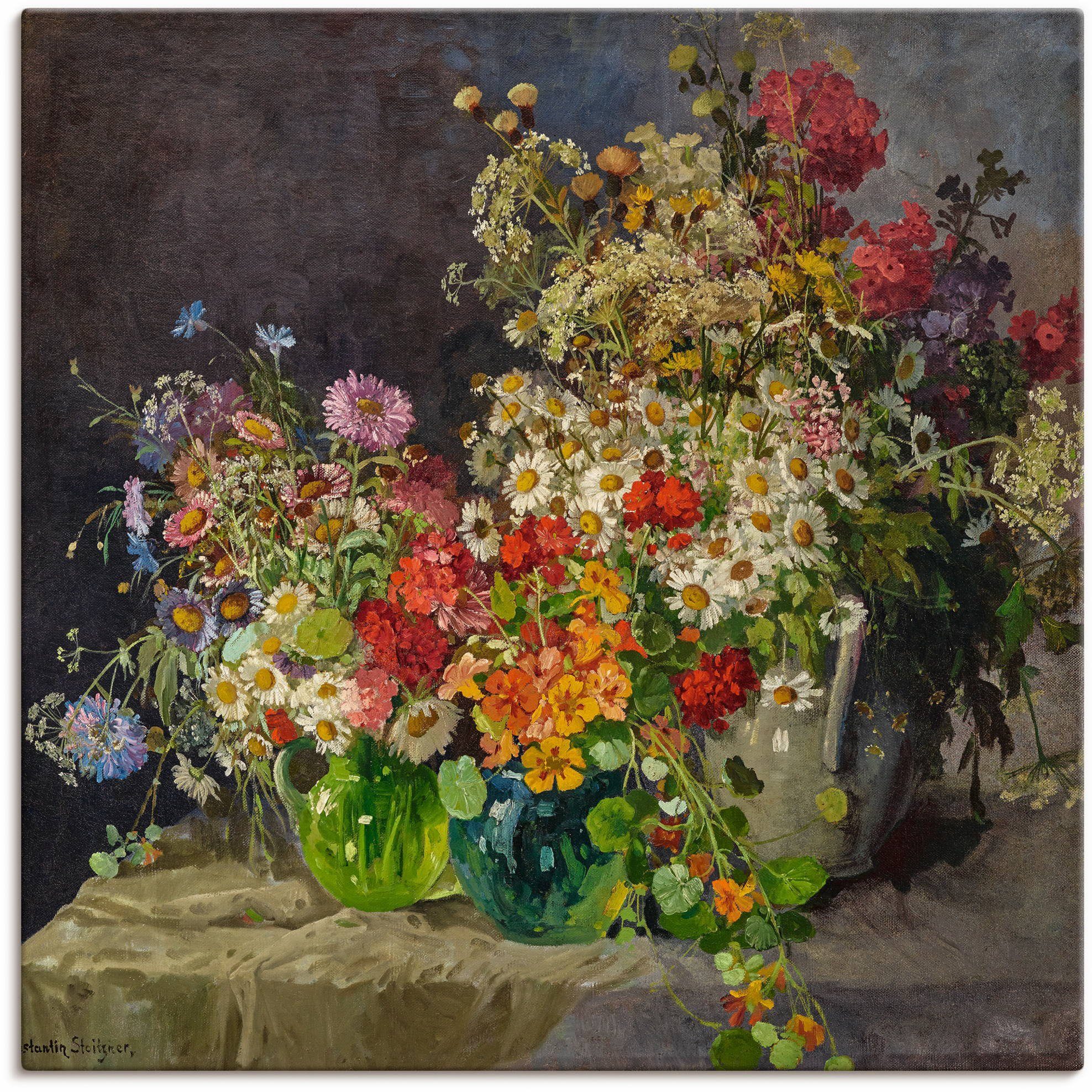 Unser mit Liebe in Handarbeit hergestelltes Leinwandbild mit dem Motiv "Stillleben mit Wiesenblumen in Krügen." von Konstantin Stoitzner überzeugt durch originalgetreue Druckqualität und hochwertige Basismaterialien. Das Motiv wird Dir wie abgebildet und fertig zum Aufhängen nach Hause geliefert.