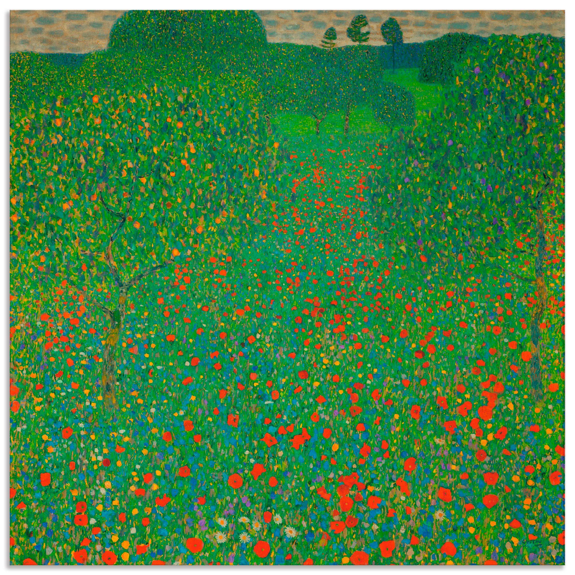 Unser mit Liebe in Handarbeit hergestelltes Wandbild mit dem Motiv Feld mit Mohn von Gustav Klimt überzeugt durch originalgetreue Druckqualität und hochwertige Basismaterialen. Das Motiv wird Dir wie abgebildet und fertig zum Aufhängen nach Hause geliefert.
