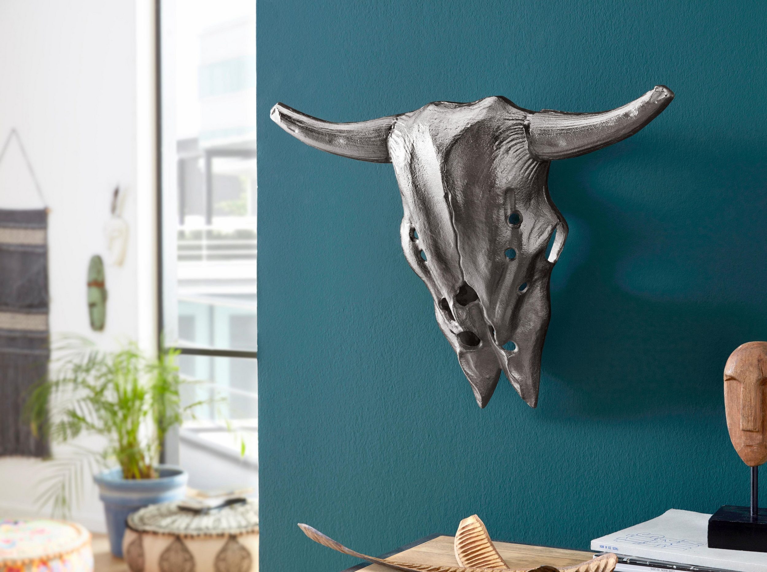 Wandfigur "Skull XL" in Form eines Stierkopfes ist ein imposantes Deko-Objekt, das durch seine außergewöhnliche Gestaltung und Розмір von 57 cm sofort ins Auge fällt. Gefertigt aus robustem Aluminium und in einem matten, silbernen Finish gehalten, vereint diese Figur modernes Design mit einem Hauch von Wildheit und Mystik. Das matte Silber verleiht dem Stierschädel eine subtile, edle Ausstrahlung und fügt sich harmonisch in verschiedene Wohnstile ein.