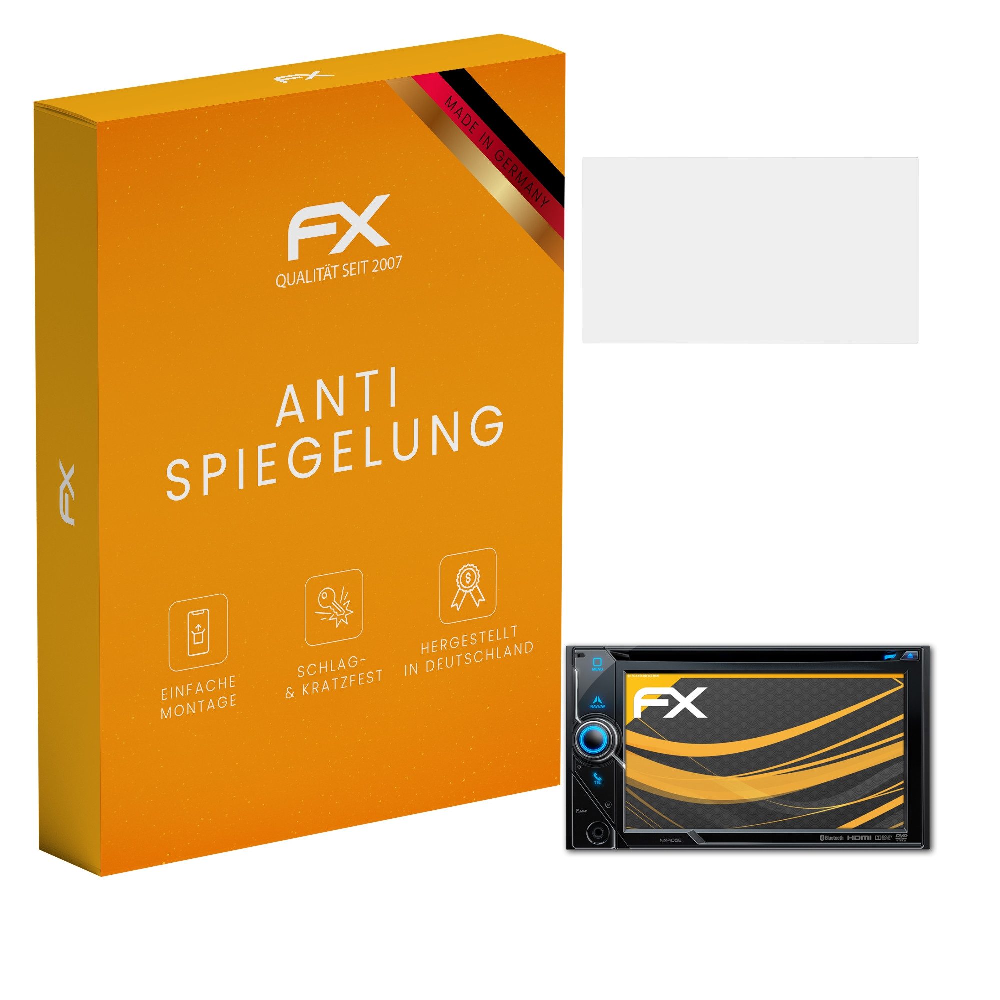 Lieferumfang | 2 x FX-Antireflex Schutzfolie kompatibel mit Clarion NX405E, Reinigungstuch, Montagewerkzeug (Rakel), Link zur mehrsprachigen, bebilderten Montageanleitung (inkl. Montagevideo), Bei Geräten mit mehreren Displays (z.B. Innen- und Außendisplay), ist für jedes Display eine Schutzfolie in der Verpackung enthalten. |