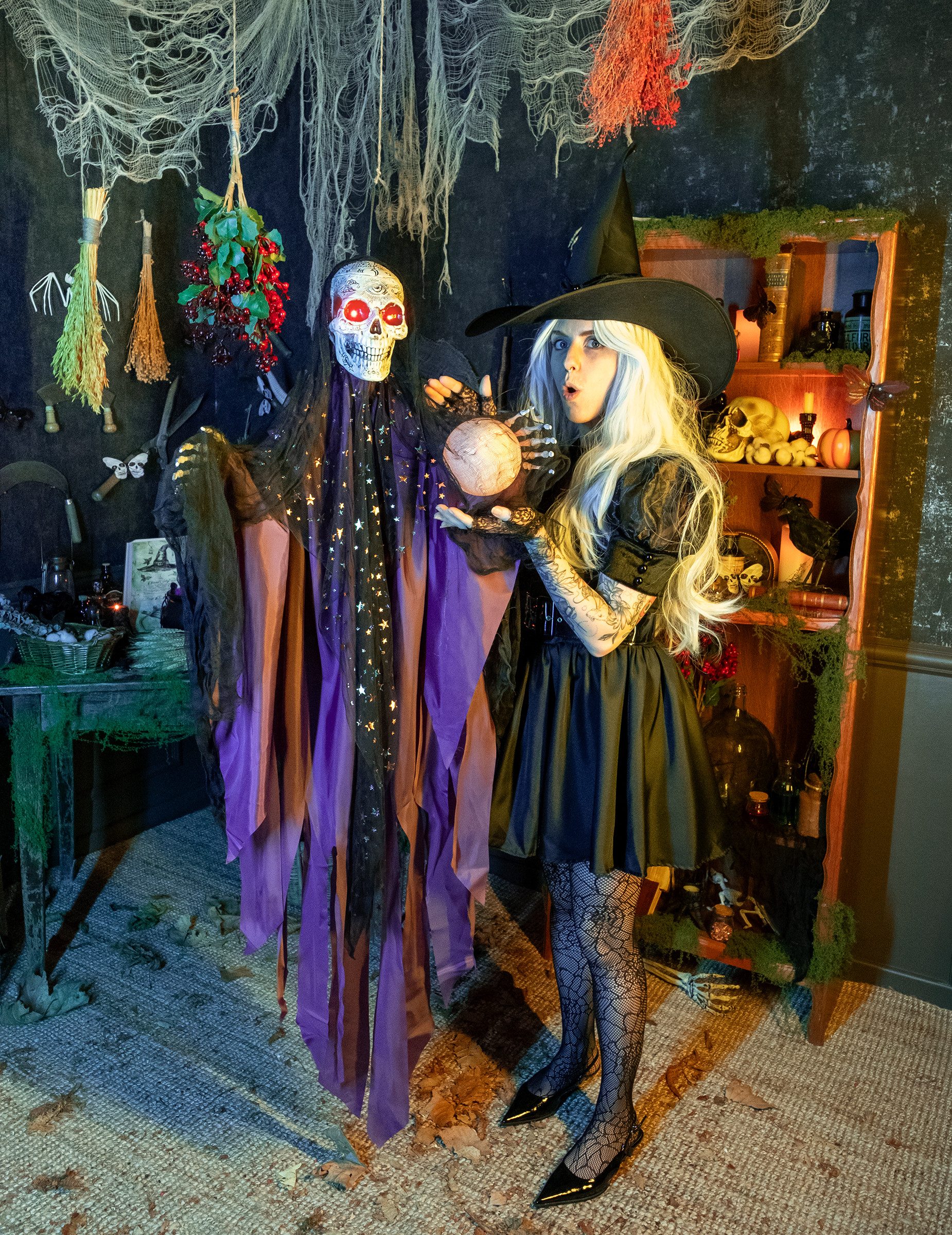 Dieses leuchtende und akustische Skelett einer Wahrsagerin ist 180 cm hoch. Diese Hängedekoration zeigt das Skelett einer Seherin, die in einen schwarz-violetten Schleier gehüllt ist, der mit Sternenmustern verziert ist. In ihren Schädel sind geheimnisvolle Symbole eingraviert, die an Zaubersprüche erinnern, die Ihnen das Blut in den Adern gefrieren lassen können. Um das Skelett einzuschalten, müssen Sie nur den Schalter umlegen und es wird beim kleinsten Geräusch lebendig. Die Wahrsagerin kichert, ihre Augen leuchten rot und blinken, und ihre Kristallkugel leuchtet, um Ihre Zukunft zu enthüllen. Sie wird mit 3 AAA-Batterien betrieben (Batterien nicht enthalten). Diese Dekoration eignet sich perfekt, um Passanten in der Halloween-Nacht zu erschrecken.