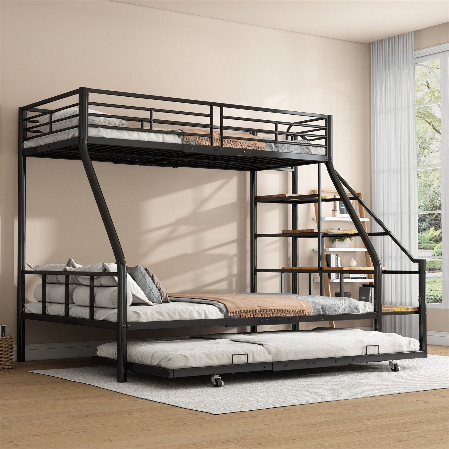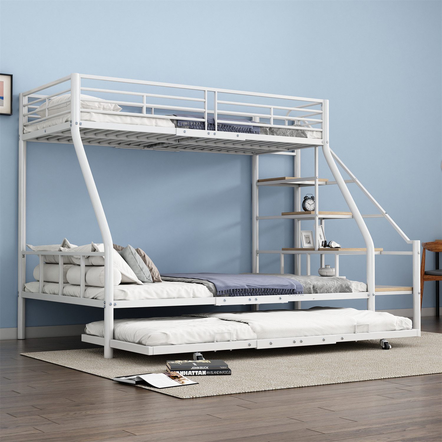 Dieses Etagenbett mit Eisenrahmen eignet sich perfekt für Familien mit mehreren Kindern oder für Personalwohnungen, Wohnungen usw. Es hat ein minimalistisches Design, das zu den meisten Innenräumen passt. Das Etagenbett nutzt den vertikalen Raum, um viel Platz zu sparen, und die beiden oberen Etagen sind mit stabilen Geländern ausgestattet, um versehentliche Stürze zu verhindern und eine erholsame Nachtruhe zu gewährleisten. Die Aufbewahrungsleiter ist so konzipiert, dass sie das Organisieren und Verstauen von Gegenständen erleichtert und für Ordnung sorgt. Das einzigartige faltbare, ausziehbare Bettdesign ermöglicht eine flexible Umwandlung vom Sofa zum Bett und bietet so unendliche Möglichkeiten für kleine Räume. Das moderne Unisex-Design ist für alle Altersgruppen geeignet. Dieses Bett ist ideal, um Platz zu sparen!