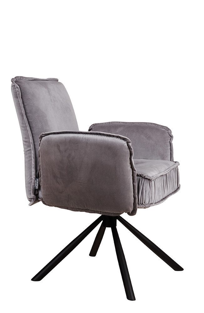 Ein stilvoller und klassischer Vollpolsterstuhl mit Metallfüßen. Die geschwungenen Armlehnen verleihen dem Stuhl eine interessante und ansprechende Optik. Die Polsterung des Stuhls ist vollständig mit hochwertigem Stoff bezogen. Er verfügt über ein Metallgestell mit 360° Drehfuntion und Rückholfunktion.