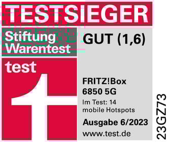 Die AVM FritzBox 6850 5G erzielt im Vergleichstest des Magazins „test“ der „Stiftung Warentest“ mit fünf weiteren mobile Hotspots mit Netzteil das Gesamtergebnis „GUT (1,6)“. Die Datenübertragung ist zuverlässig. Das Gerät ist am einfachsten zu bedienen. Auch der „sehr gute“ Basisschutz persönlicher Daten überzeugt. Außerdem verbraucht der mobile Hotspot sehr wenig Strom. Insgesamt ist er der „TESTSIEGER“.