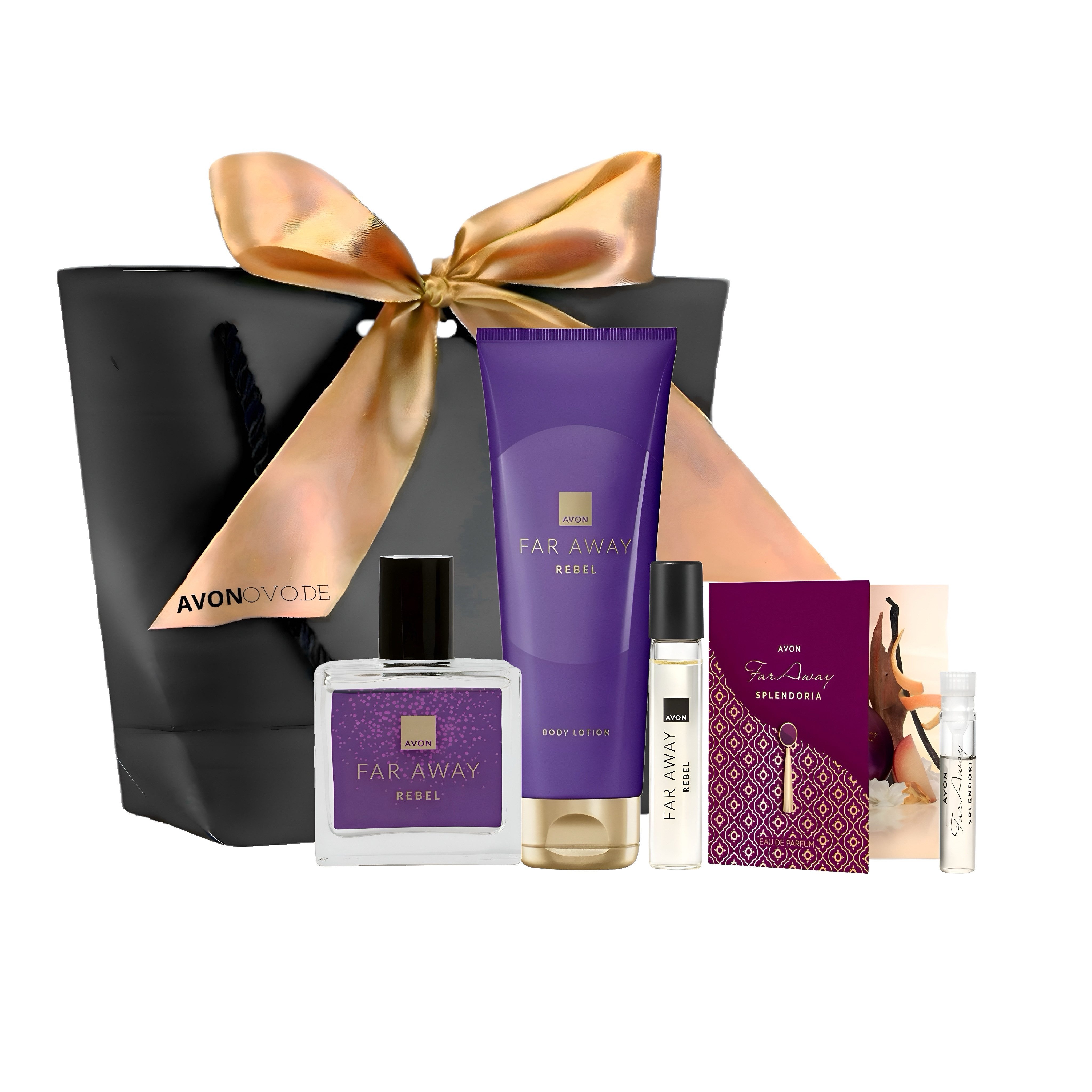 Lieferumfang | FAR AWAY REBEL Spray 30 ml, Körperlotion 125 ml, Taschenspray 10 ml, Geschenktasche, Duftprobe. |