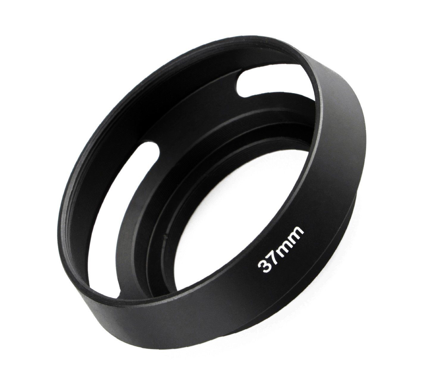 Diese Sonnenblende verfügt über drei Aussparungen, durch die bei dunkleren Aufnahmesituationen indirekter Lichteinfall von hinten genutzt wird. An der vorderen Seite befindet sich ein größeres Innengewinde für die Anbringung von Фільтри.