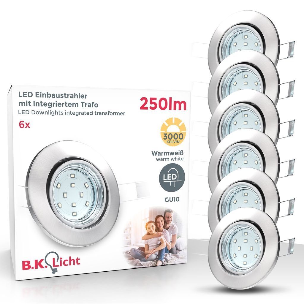Wissenswertes | LED Einbauleuchten-Set, 6er-Set - Metall / matt-nickel - inkl. 6 x LED/GU10 3W 250lm 3.000K - Lebensdauer 20.000 h, Ra>=80, - nicht dimmbar, schwenkbar - IP23 - 86x70mm (DxH) - Einbautiefe 60mm - Einbaumaß 68mm (D) |