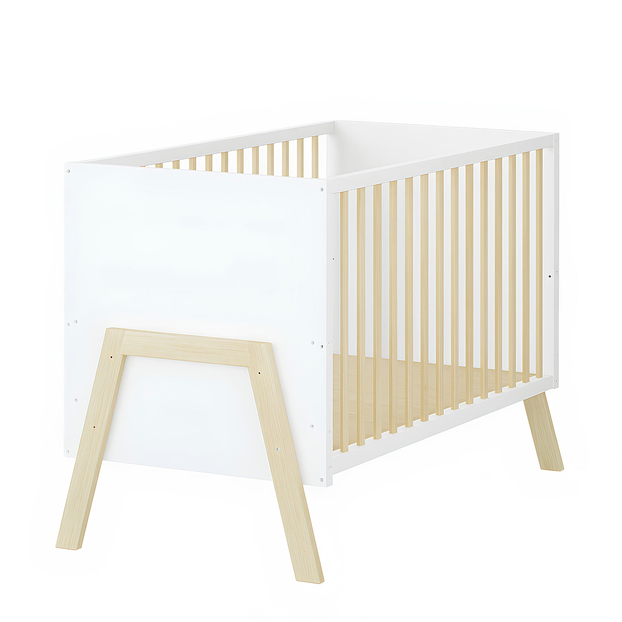Die hochwertig weiß lackierten Seitenteile in Kombination mit den naturbelassenen Holzsprossen verleihen dem Babybett einen eleganten, skandinavischen Look, der sich harmonisch in jedes Babyzimmer einfügt.