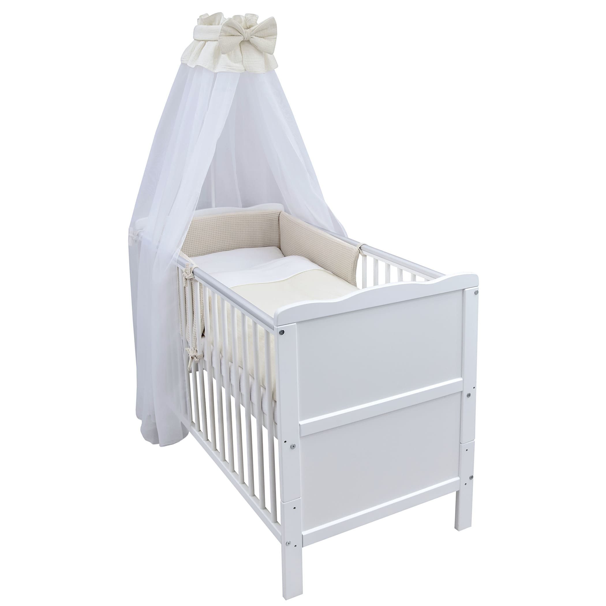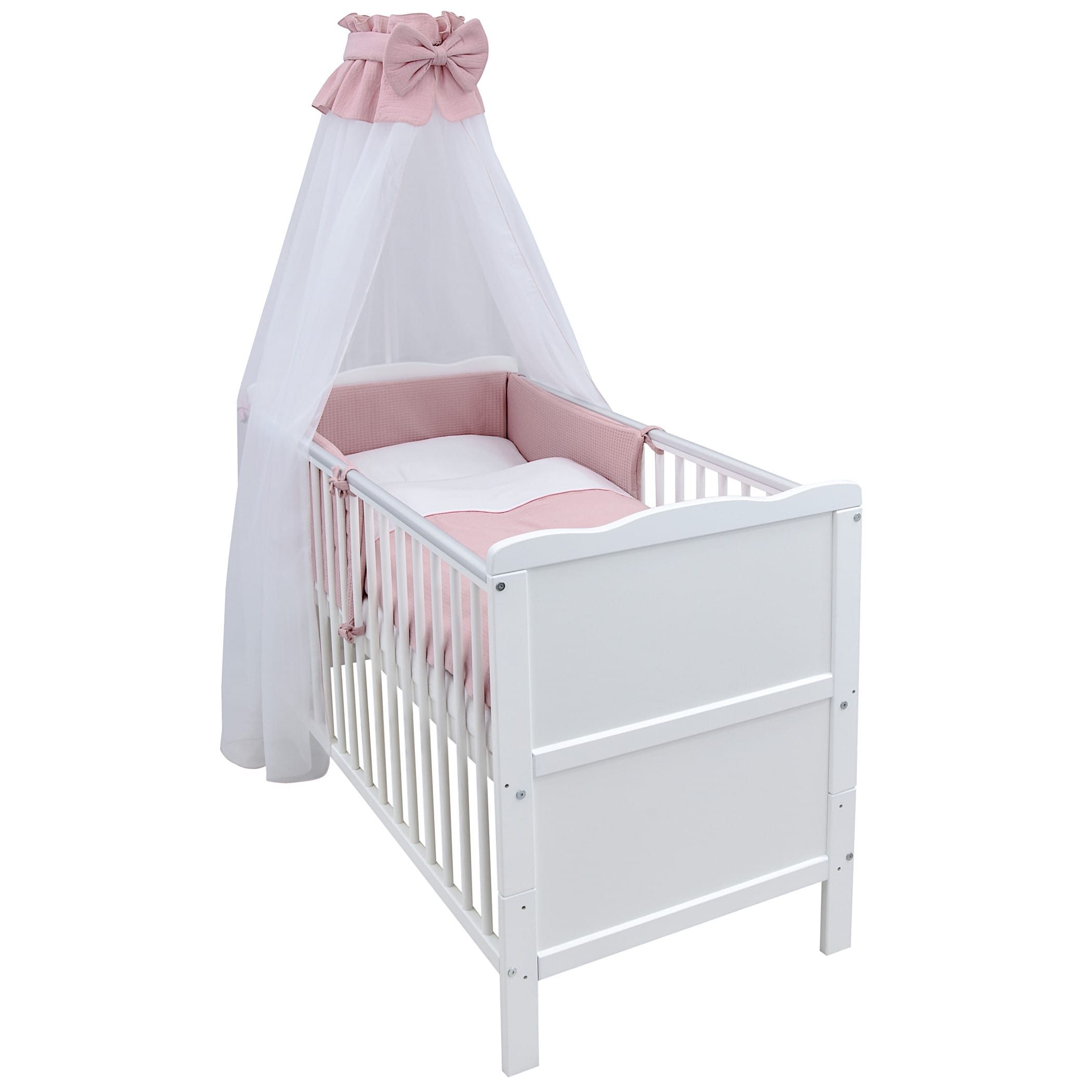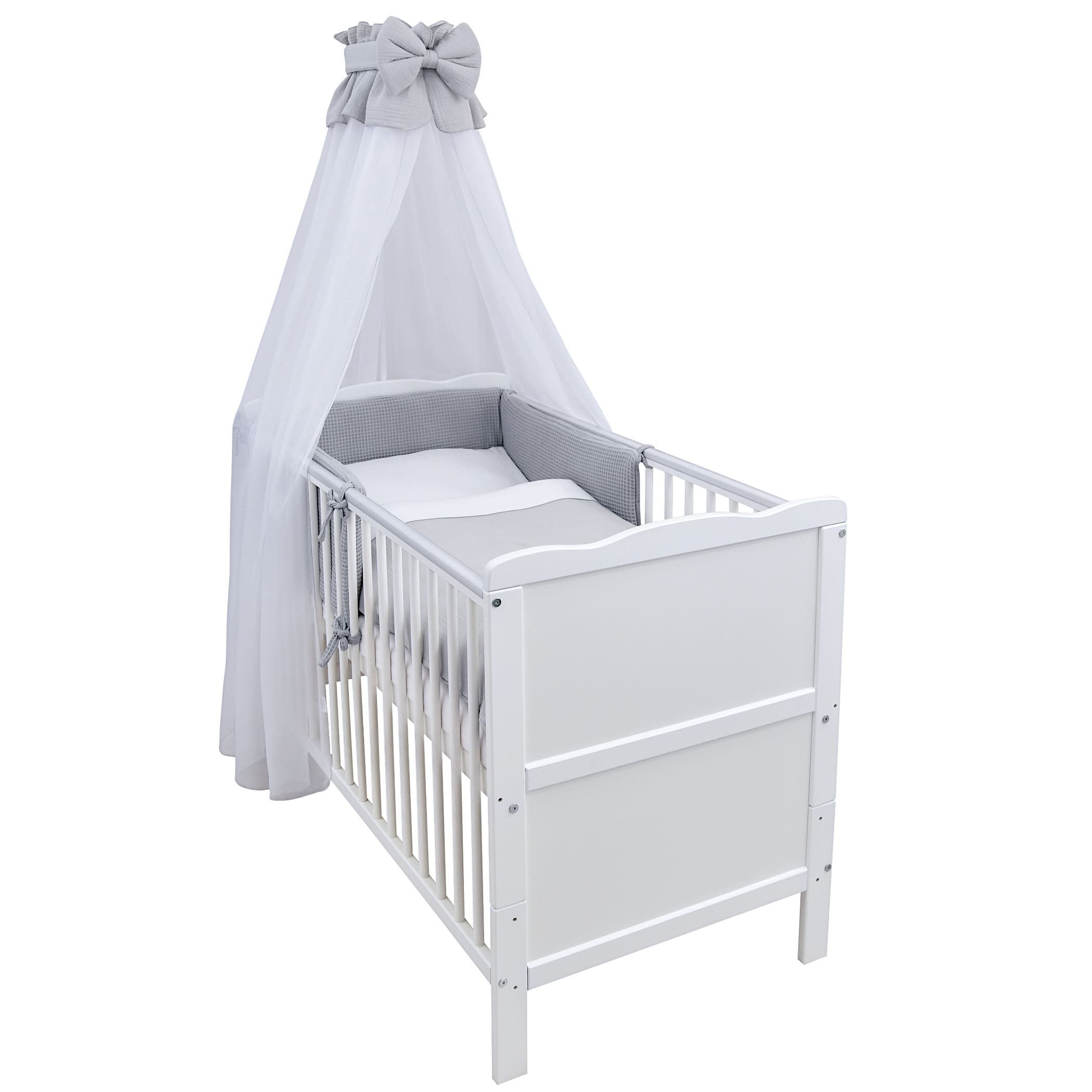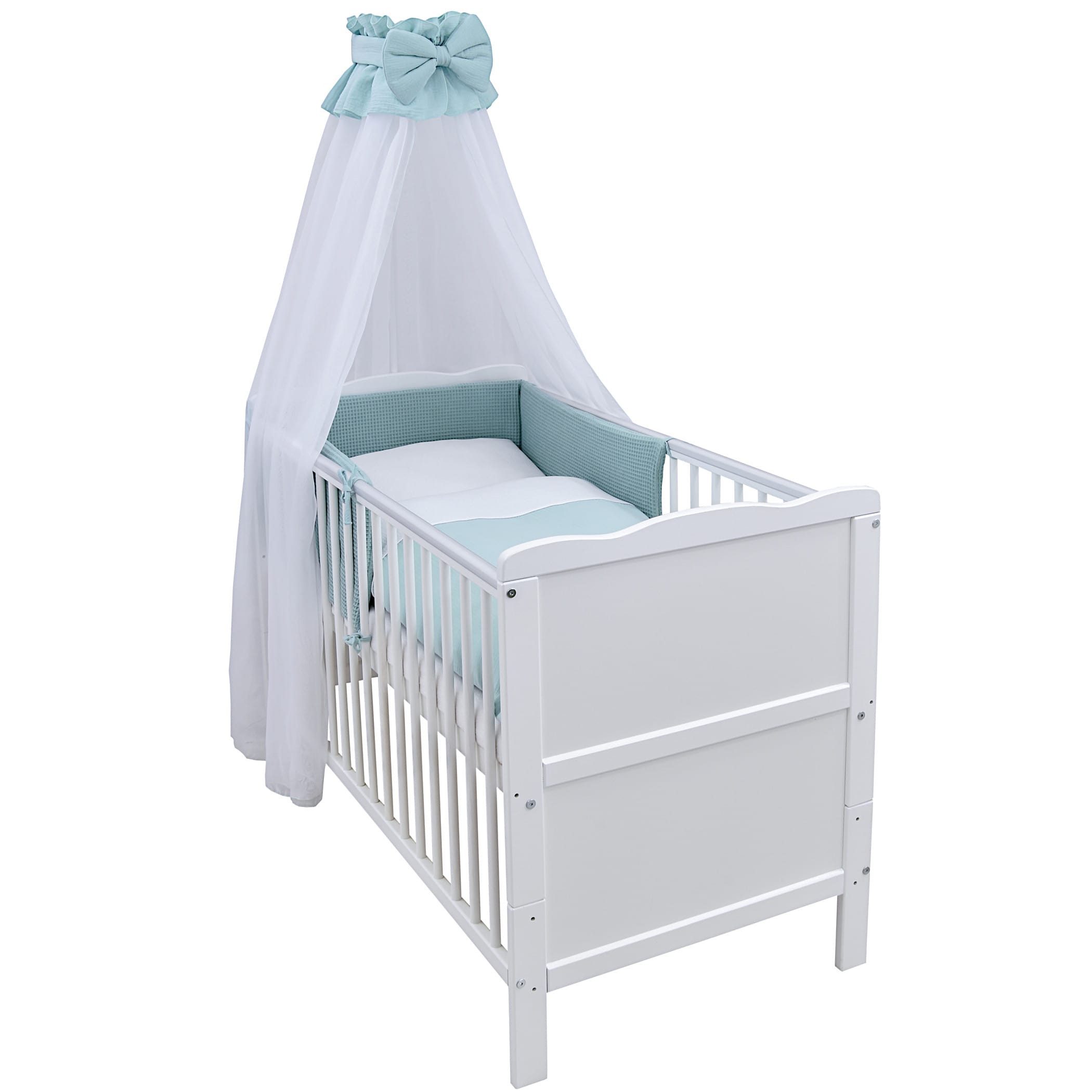 Das umfassende Set enthält eine bequeme Matratze, ein kuscheliges Nestchen aus hochwertigem Waffelpique in Blau, einen zauberhaften Chiffonhimmel sowie Kissen und Decke. Die Bettwäsche ist aus weichem Musselin gefertigt und in einem schlichten Blau gehalten – passend zum Nestchen. Der Waffelpique überzeugt durch seine besondere Struktur, die nicht nur optisch ansprechend ist, sondern auch atmungsaktiv wirkt, angenehm weich auf der Haut liegt und zudem sehr pflegeleicht ist – ideal für die empfindliche Babyhaut. Der Chiffonhimmel schafft eine ruhige Schlafumgebung und rundet das harmonische Gesamtbild ab.