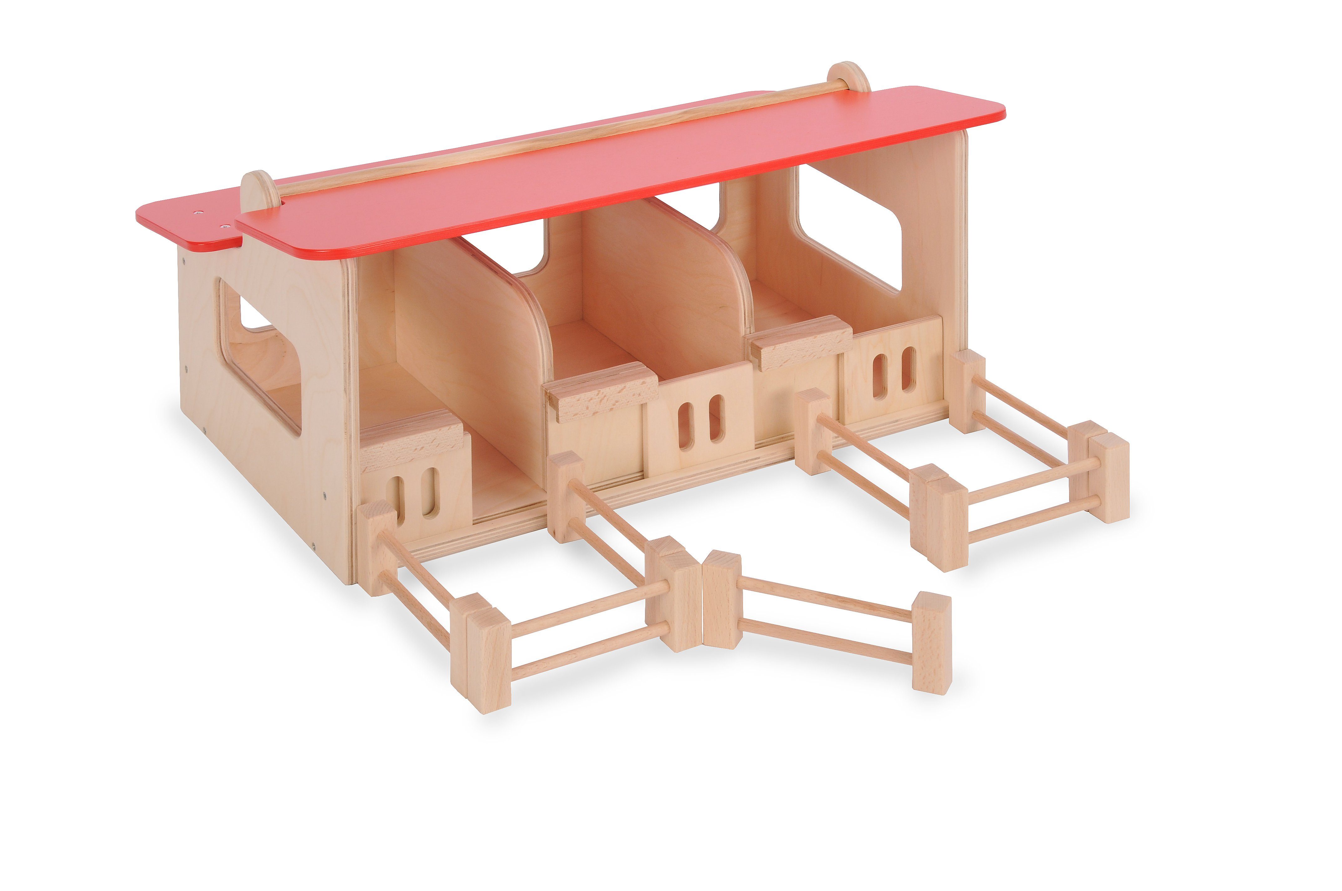 Ausstattung | 1 Stallgebäude, 7 Zaunelemente, 3 Boxen mit Scheibetüren |