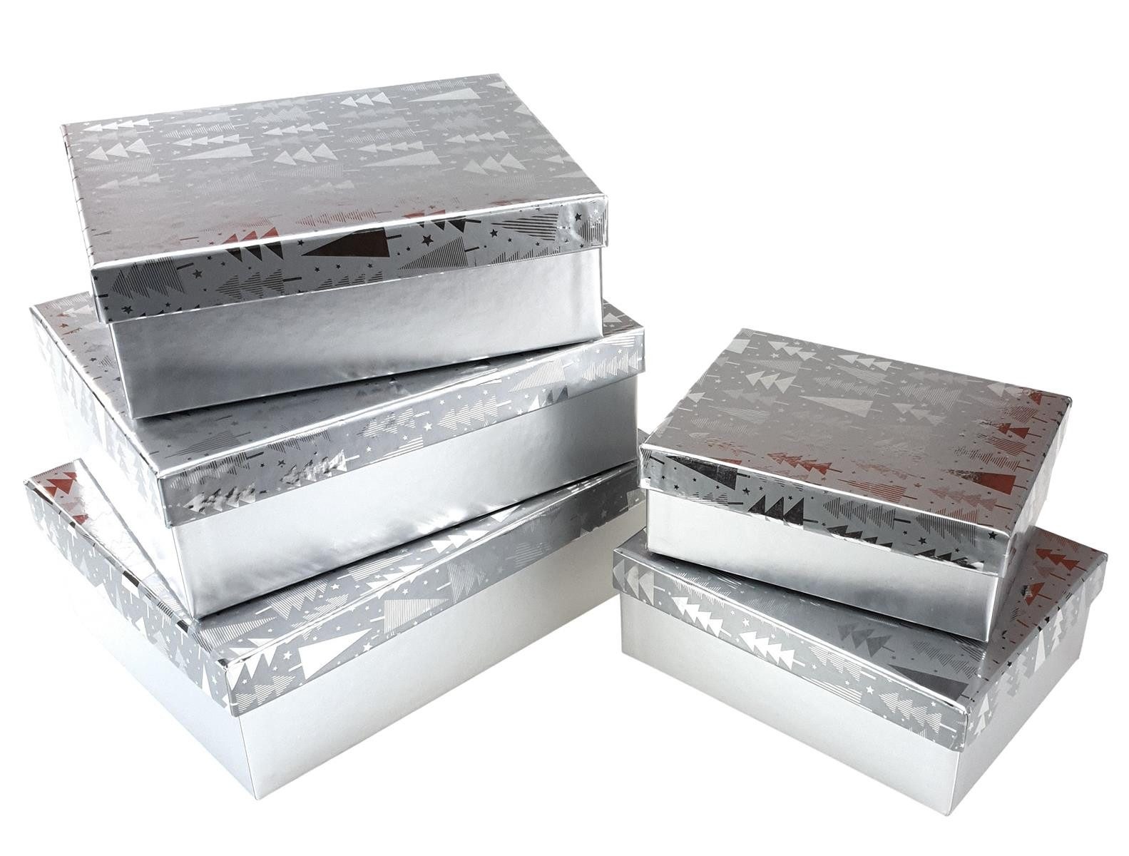 Das 5 teilige Geschenkbox Set von Bambelaa bieten die Möglichkeit, Ihre Geschenke schön zu verpacken. Ebenfalls praktisch ist, dass die Geschenkboxen wiederverwendbar sind und daher im Vergleich zum üblichen Geschenkpapier umweltfreundlicher sind. Die Schachteln sind in der Farbe silber erhältlich und der Deckel ist mit grau - silbernen Tannenbäumen und Sternen bedruckt. Die fünf Boxen besitzen verschiedenen Größen, die Maße hierfür sind: