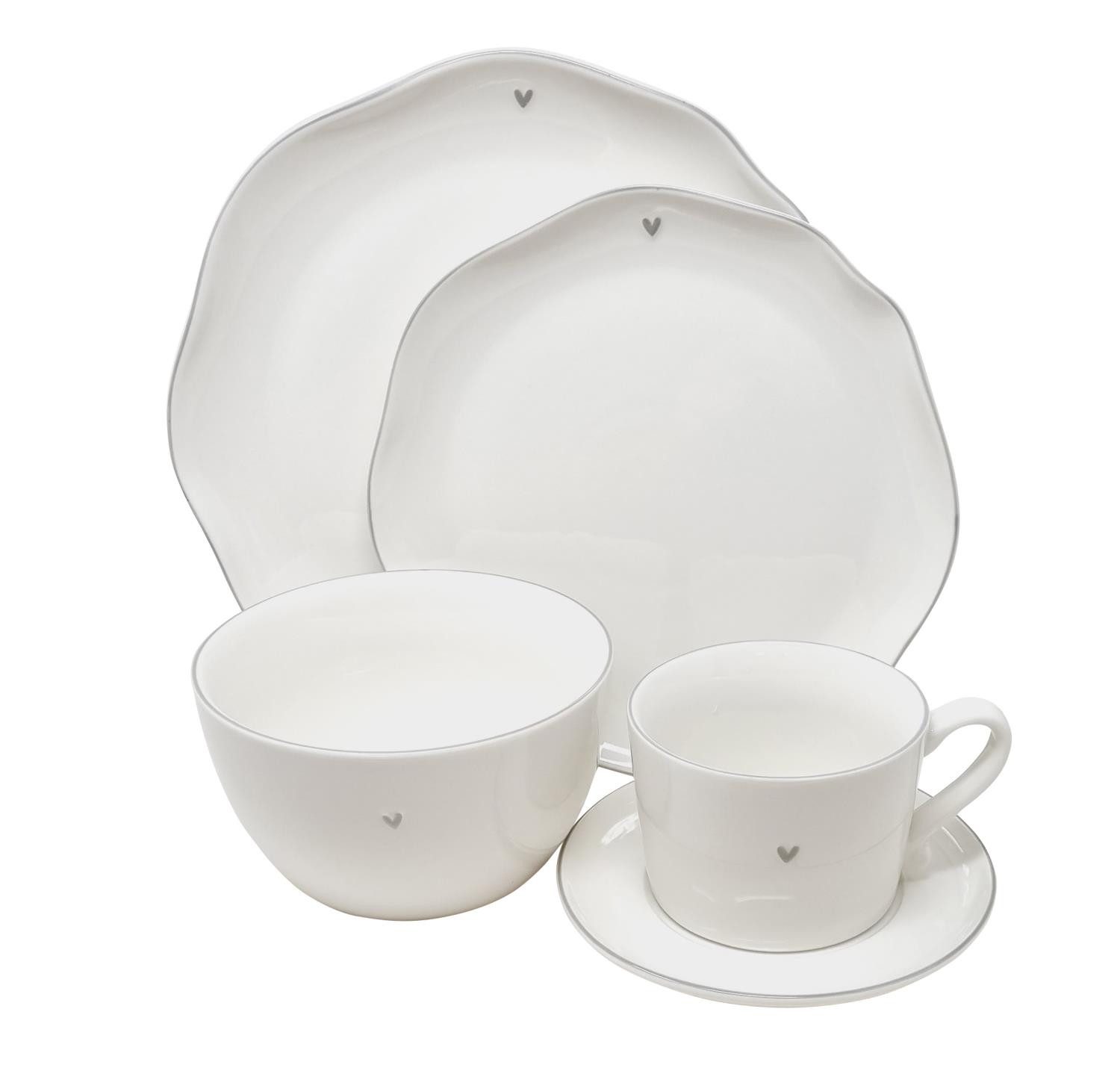 Lieferumfang: 30 teiliges Kombiservice bestehend aus 6x Tasse, 6x Untertasse, 6x Frühstücksteller, 6x Müslischale, 6x Speiseteller Frühstücksteller Maße: Durchmesser 23cm, Müslischale Maße: Höhe 8,5cm, Durchmesser 15cm; Füllmenge max. ca. 900ml Tasse Maße: Höhe 7cm, Durchmesser 10cm, Довжина mit Henkel 12,5cm, Füllmenge ca.300ml, Unterteller Maße: Durchmesser 15cm; Stellfläche / Spiegel 9cm, Höhe 1,7cm Speiseteller Maße: Durchmesser 27cm Farbe: weiß mit grauemem Rand und Herz | Material: Keramik spülmaschinenfest & mikrowellengeeignet Dieses Produkt ist ein Unikat - kleine Unregelemäßigkeiten in Form und Farbe können durch die individuelle Produktion auftreten