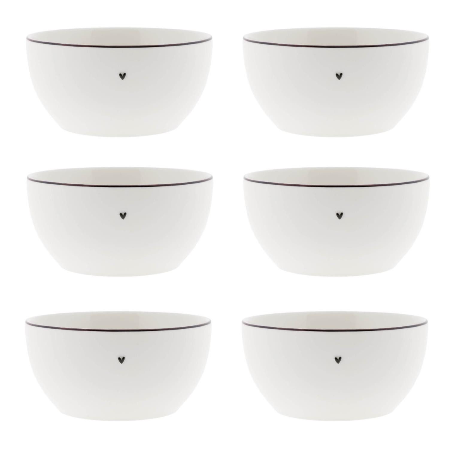 Lieferumfang: 6 Dessertschalen / Müslischalen mit kleinem schwarzen Herz und schwarzem Rand