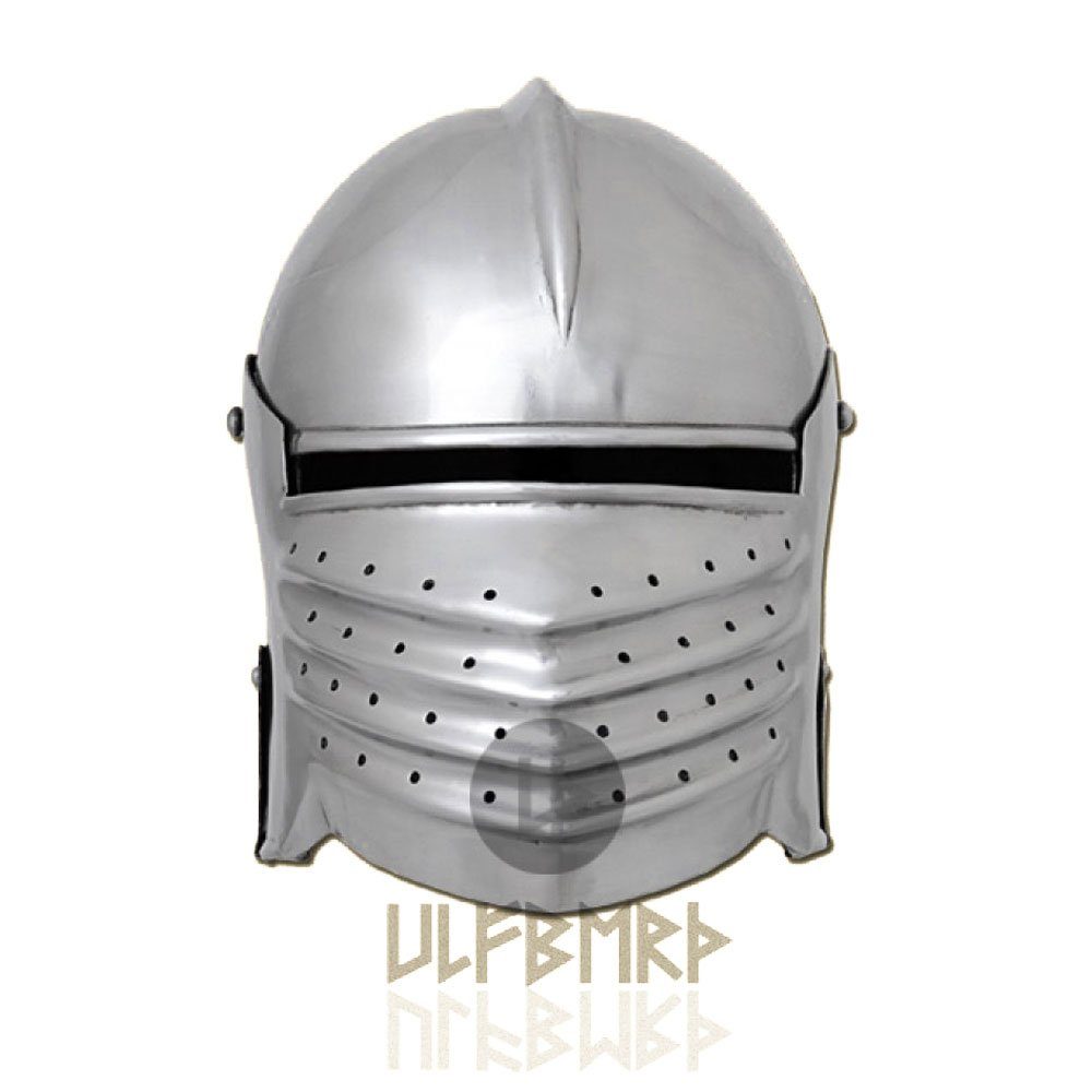 Dieser Blasebalg-Schaller stellt eine Rekonstruktion eines spätmittelalterlichen Schallers dar, der wahrscheinlich gegen 1490 von Plattnern in Norditalien hergestellt wurde. Aufgrund seins ungewöhnlichen Visieres wird dieser Helm Blasebalg-Schaller genannt.