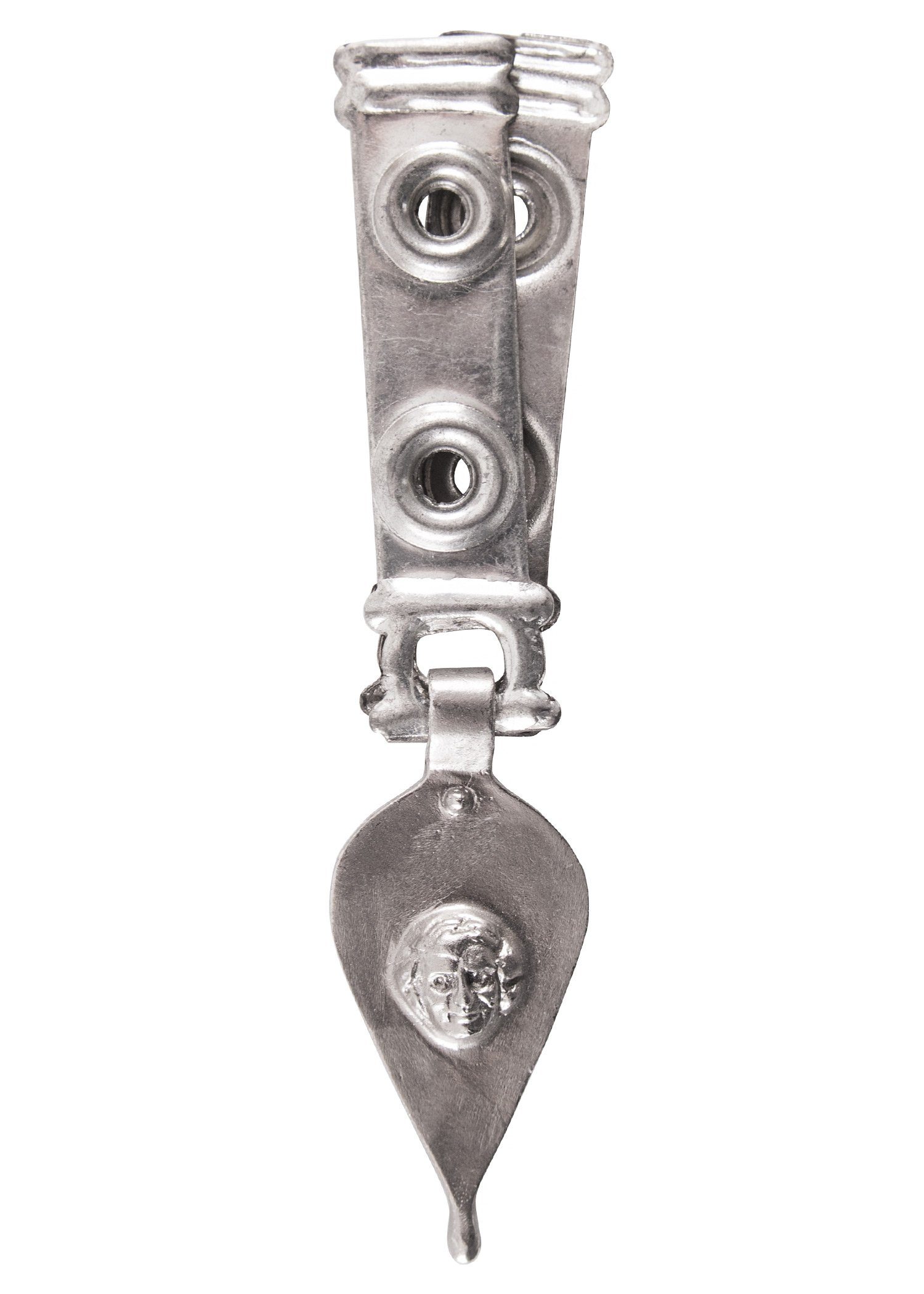 Diese Nachbildung ist aus 2 mm starkem Messing gefertigt und anschließend, für eine silberne Optik, verzinnt. Um die Endklammer einfach an den Riemen zu befestigen, wurden 2 Bleche angebracht, mit denen das Lederteil zusammengezwickt wird. Mit Nieten lässt sich die Endklammer dann befestigen.
