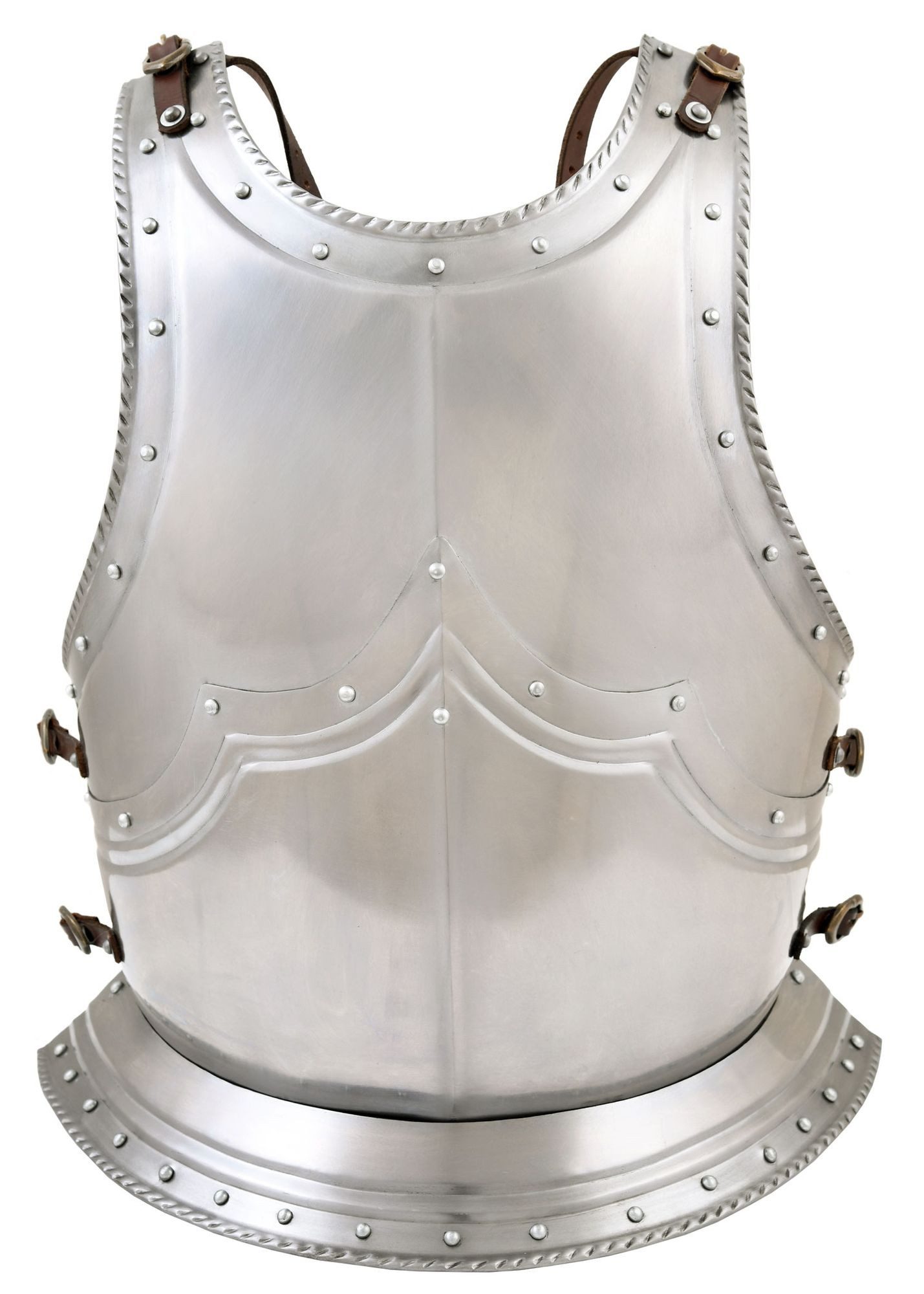 Dieser Nachbau eines spätmittelalterlichen Harnischs ist aus 1,2 mm (18 gauge) Stahl gefertigt. Er besteht aus einem Brustpanzer und einem Rückenpanzer und hat die für die gotischen Plattenrüstungen des Spätmittelalters (15. /16. Jh.) typische mehrschichtige Aufmachung.