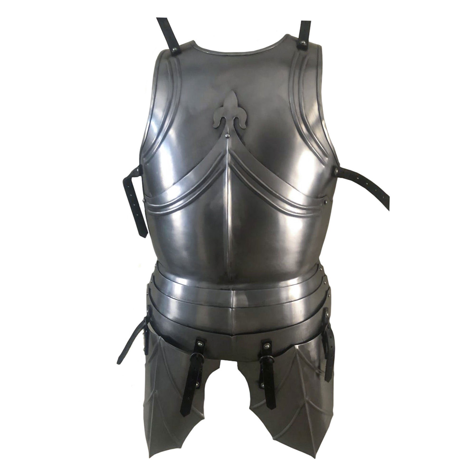 Das Bruststück, welches zum Schutz der Hüften, Taille, der Leiste und des Unterleibes dient, wurde aus 3 geschobenen Bauchreifen gefertigt. Der wunderschöne Rückenpanzer wird durch ein weit ausgestellter Culet vervollständigt, welches aus zwei wellenförmigen Platten besteht, die sich ebenfalls überlappen und somit auch das Gesäß schützen.