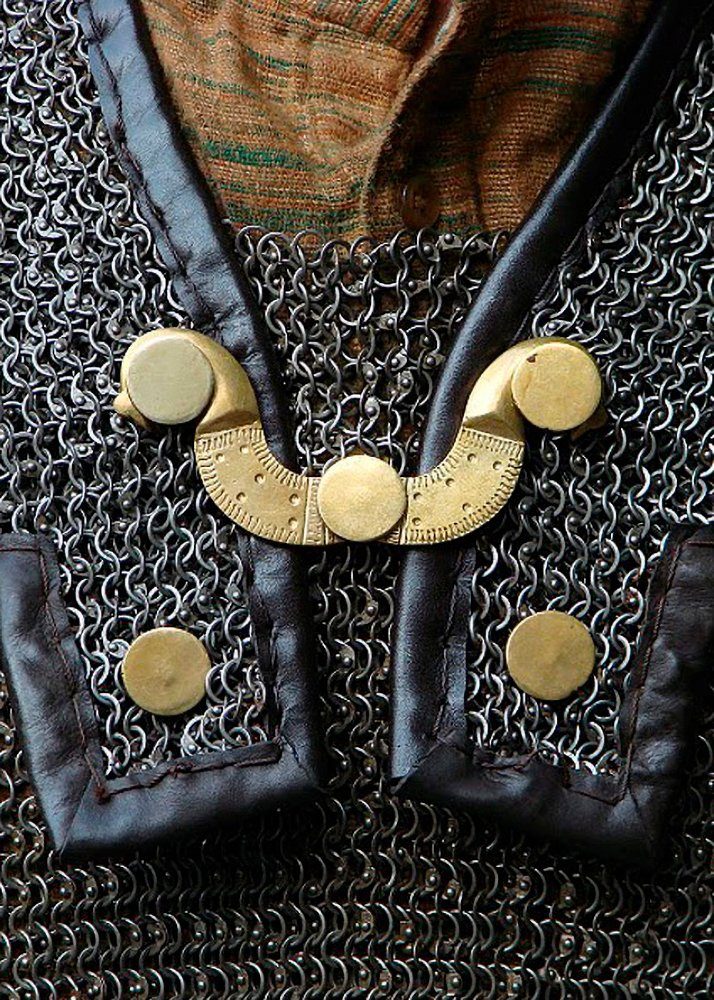 Gefertigt wurden die Haken, Ösen und Knöpfe aus Messing, die 5 Konterscheiben der Knöpfe sind aus Eisen. Dieses 14-teilige Set zur Selbstmontage ist für das römische Kettenhemd Lorica Hamata geeignet aber auch für jene, die ihr Hemd selbst herstellen oder modifizieren möchten.
