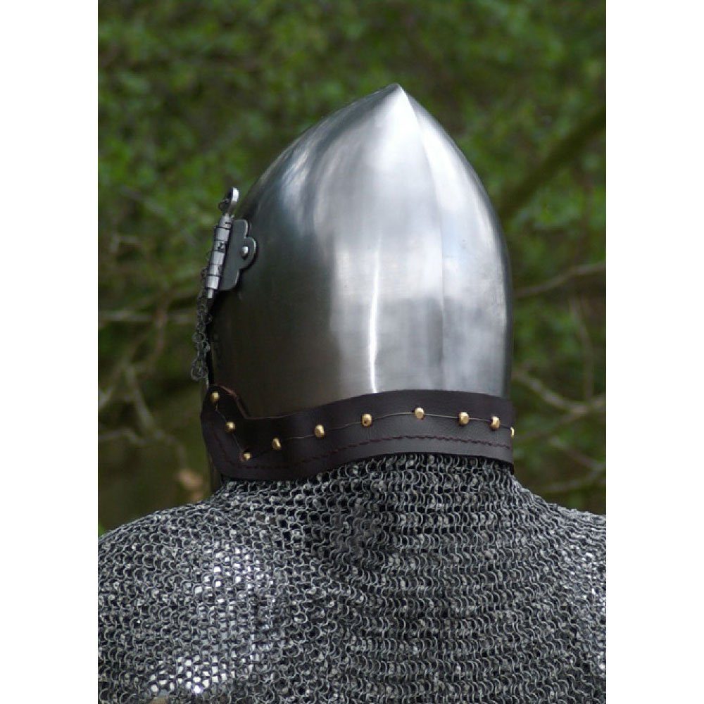 Der Rand wurde aus dickem Rindsleder gefertigt, der an das Kettengeflecht genäht wurde. Die Befestigungslöcher für den Helm müssen kundenseits selbst angebracht werden.