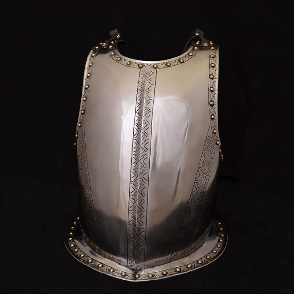 Dieser schöne Brustpanzer ist eine Nachbildung eines mittelalterlichen Plattenpanzers aus Stahl. Er wurde reichlich an Gravierungen und schmückenden Messingnieten verziert.