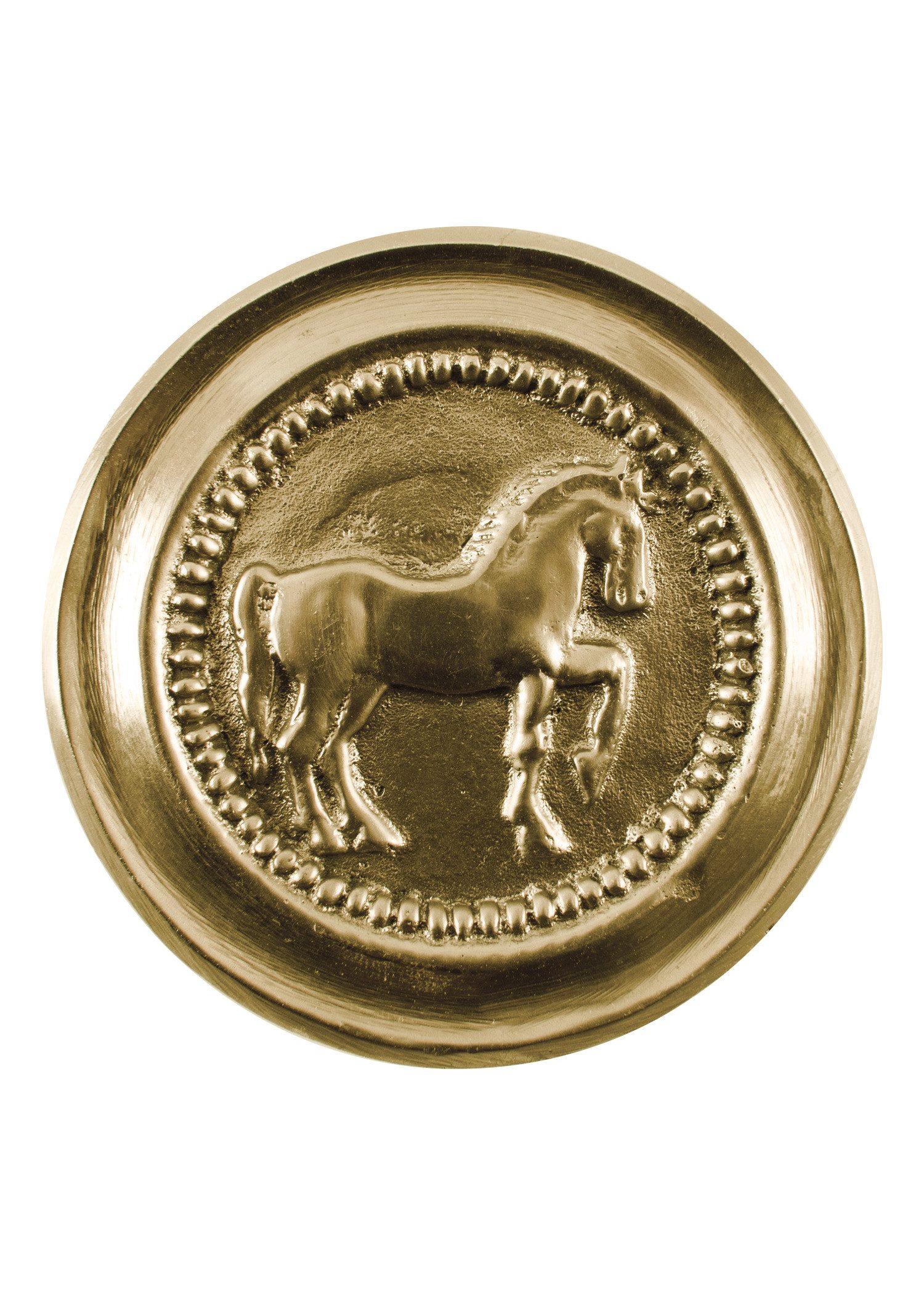 Diese Nachbildung einer römischen Phalera ist aus Messing. Sie trägt das Bildnis eines trabenden Pferdes. Sie ist ideal zum Bestücken eines eigenen Brustgeschirrs und eignet sich auch als Ersatzteil Die Lieferung erfolgt ohne Befestigungsmaterial. Sie ist in zwei unterschiedlichen Farben erhältlich: goldfarben (Messing) oder silberfarben (Messing, verzinnt).