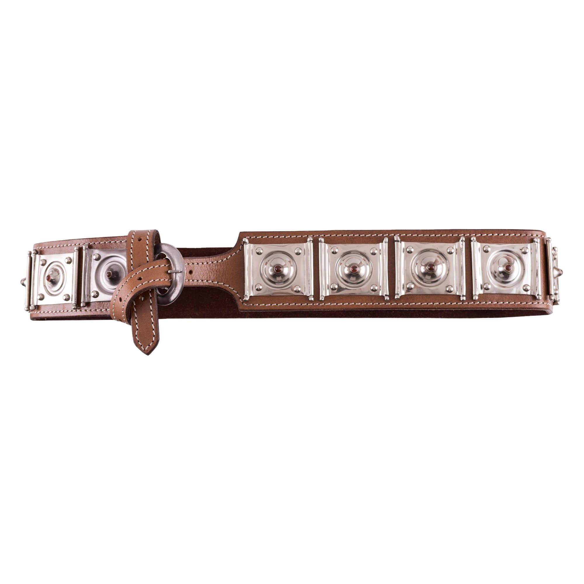 Er ist aus 3 mm starken, robustem Leder gefertigt und mit zierenden Metallplättchen ausgeschmückt. Damit die angenieteten Metallplättchen die darunterliegende Tunika nicht beschädigen, ist der Gürtel zusätzlich innen mit einer Schicht Veloursleder ausgekleidet. Der Gürtel ist vorgestanzt und kann somit in seiner Розмір verstellt werden.