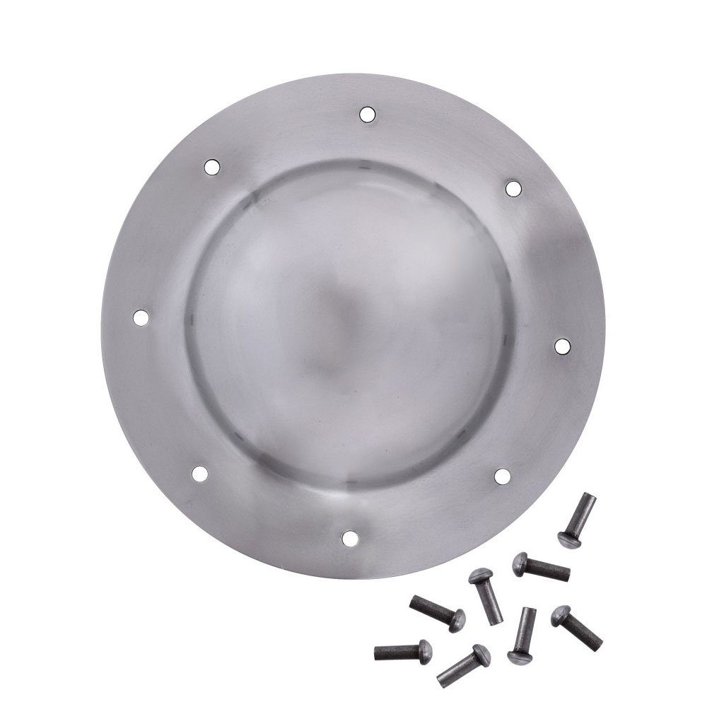Ein großer, mittelalterlicher Schildbuckel aus Stahl. Er wird mithilfe von 8 Nieten an dem Schild befestigt.