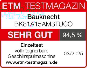 Die Bauknecht BK81A15AM3TUCO erzielt im Einzeltest des „ETM TESTMAGAZINS“ das Gesamtergebnis „sehr gut (94,5 %)“. Die Reinigungs- und Trocknungsleistung ist sehr hoch. Sowohl die Anzeigen als auch die Spülprogramme sind hervorragend und das Gerät ist einfach zu bedienen sowie ein- und auszuräumen. Außerdem verbraucht es sehr wenig Strom und Wasser und der Schallausstoß ist sehr gering. Insgesamt liefert das Modell „Spülpower zum Sparpreis“.