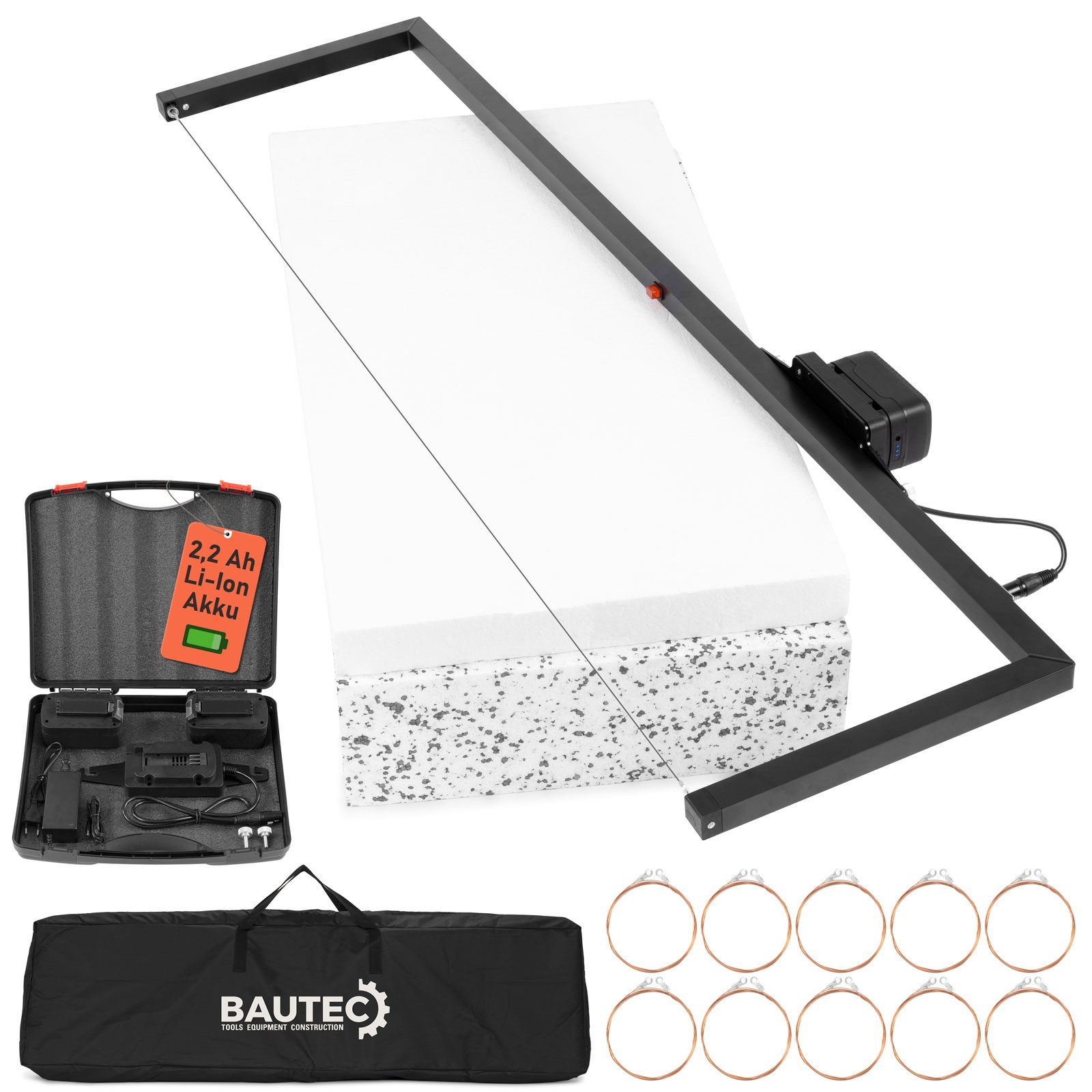 Lieferumfang | 1x BAUTEC Styrobow Handschneidebügel (1.330/330mm); 2x Li-Ion Akku (37V/2.2Ah) + Ladegerät im Koffer; 10x Schneidedraht; 1x Softbag |