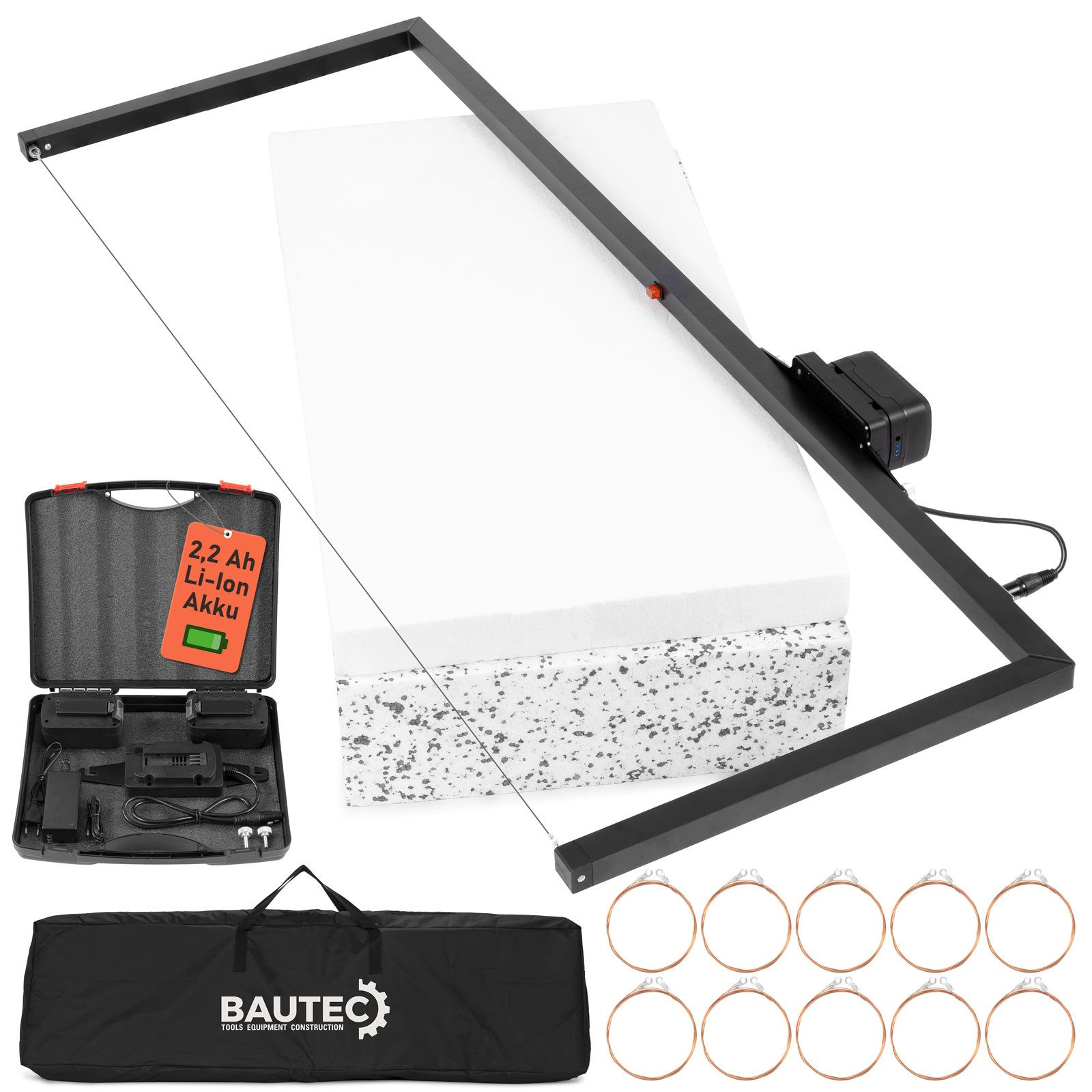 Lieferumfang | 1x BAUTEC Styrobow Handschneidebügel (1.330/520mm); 2x Li-Ion Akku (37V/2.2Ah) + Ladegerät im Koffer; 10x Schneidedraht; 1x Softbag |