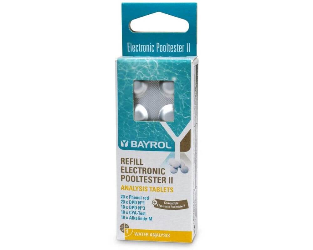 Die Anwendung des BAYROL Nachfüllpacks für den elektronischen Pooltester II erfolgt durch die gezielte Zugabe einzelner Tabletten zu Wasserproben aus dem Schwimmbecken, um die wichtigsten chemischen Parameter der Wasserqualität zu analysieren. Dabei wird jede Tablette entsprechend dem gewünschten Messwert in eine vorgegebene Menge Wasser im Photometer gegeben. Nach dem Auflösen der Tablette reagiert diese mit der Wasserprobe und ermöglicht eine fotometrische Messung des spezifischen Werts.