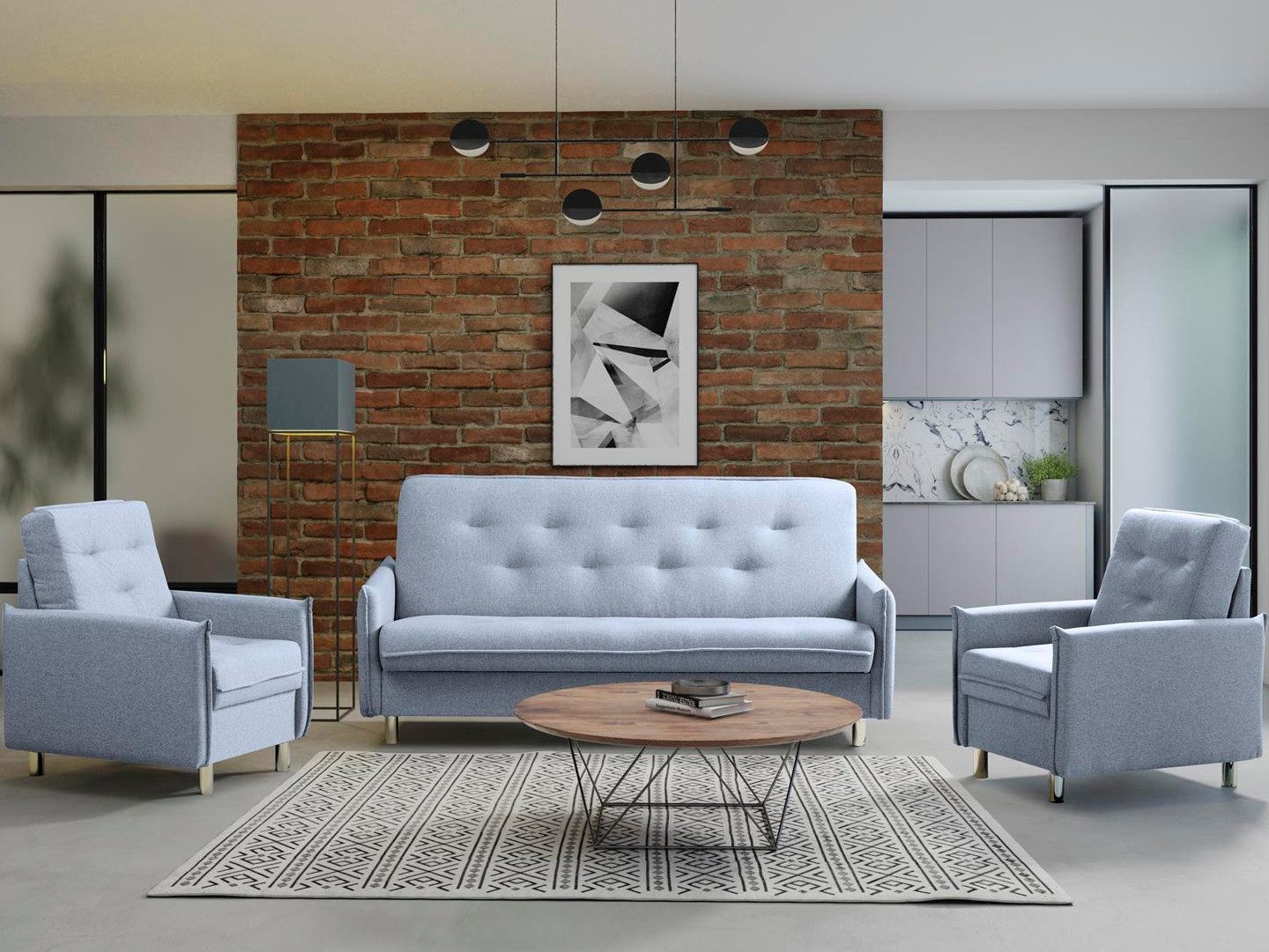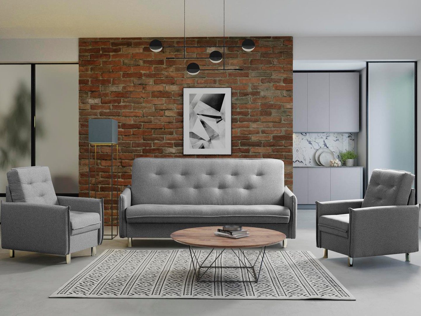 Der wunderbare Polstergarnitur Loretto ist perfekt für jeden Raum und ermöglicht es Ihnen, eine gemütliche Entspannungsecke zu schaffen, in der Sie sich mit Ihrem Lieblingsbuch oder Ihrer Lieblingsserie entspannen können. Es besteht aus einem Sofa und zwei Sesseln. Der weiche, gut profilierte Sitz bietet Ihnen hohen Komfort und lässt Sie auf hohem Niveau ruhen. Die Wellenfeder absorbiert den Druck und verhindert, dass der Sitz zusammenbricht. Der Polsterset Loretto besticht durch seinen markanten Korpus mit einer massiven Form, die von schlanken, hohen Armlehnen gebrochen wird. Ein weiches Kissen verleiht den Möbeln einen einzigartigen Charme. Dank der Klick-Klack-Mechanik können Sie das Sofa jederzeit in ein Daybed mit einer Liegefläche von 190 x 128 cm verwandeln. Das Loretto Set passt in moderne, klassische oder skandinavische Innenräume.