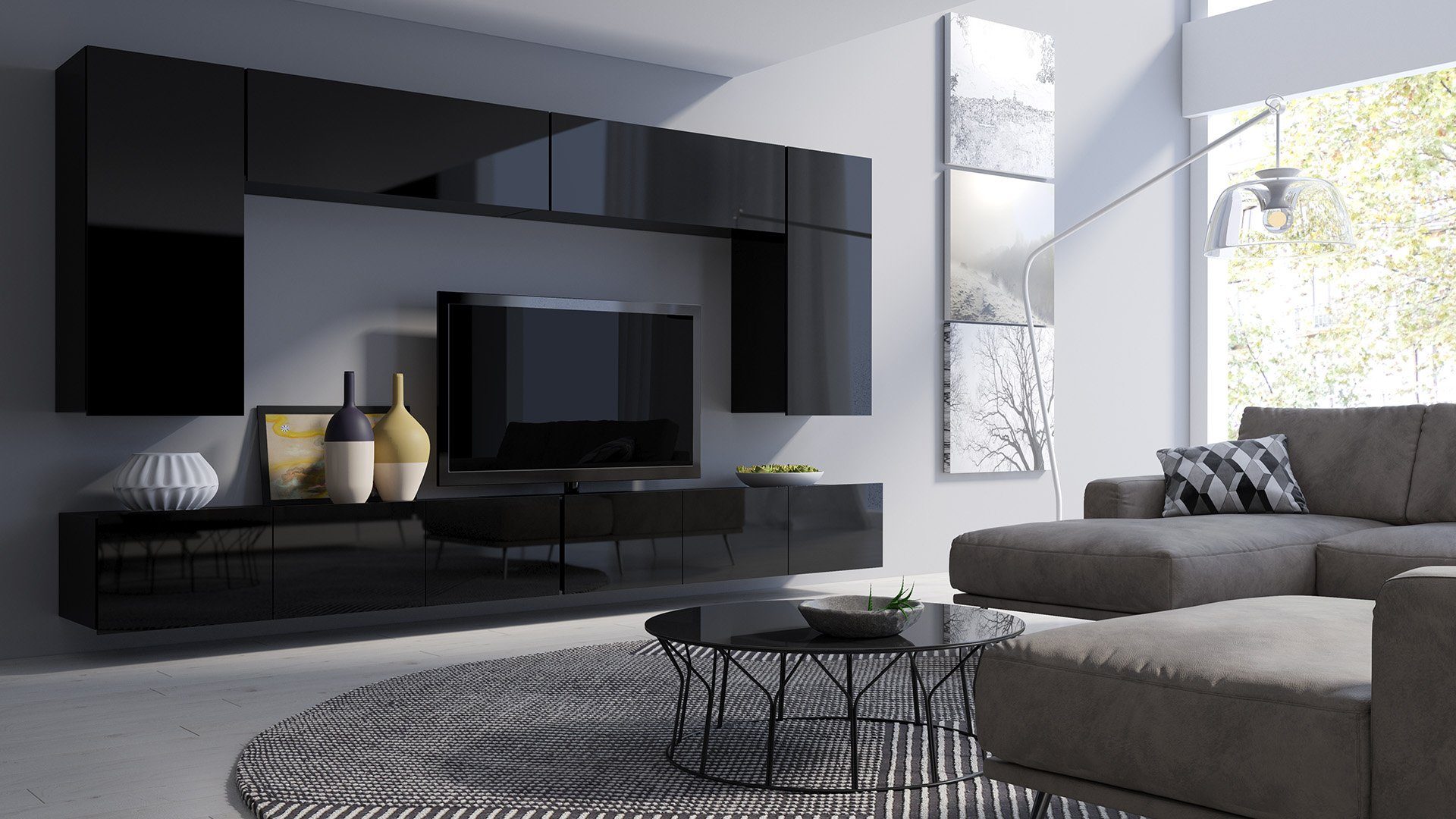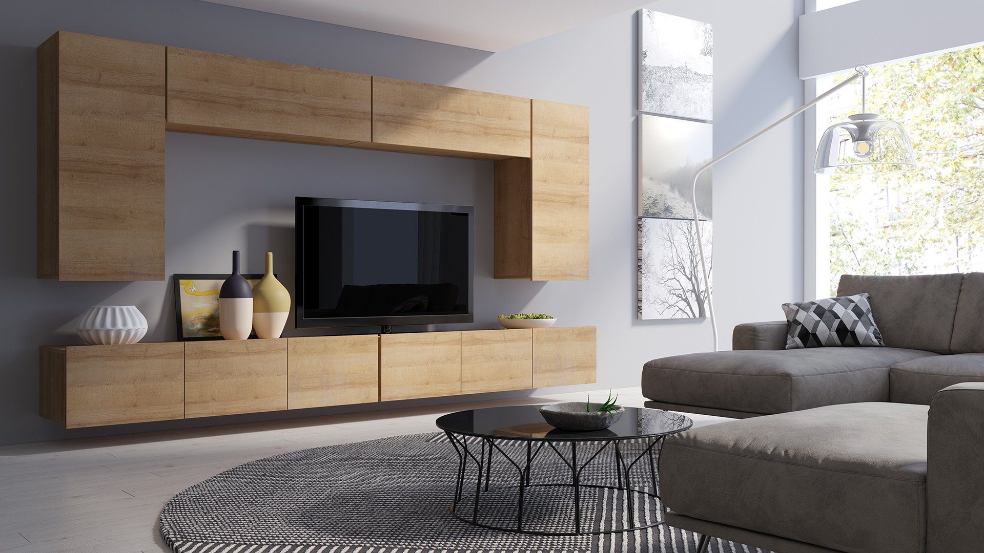 Die moderne Möbelwand Calabrini XIII ist ein minimalistisches Möbelstück. Das Set aus 6 funktionalen Elementen eignet sich hervorragend für Innenräume, die für Designer oft eine Herausforderung darstellen. Die moderne Wandleuchte Calabrini I ermöglicht eine perfekte Raumplanung im Wohnzimmer. Vertikale Regale von geringer Розмір betonen den modernen Charakter des Wohnzimmers und zeigen den bebauten Raum. Ein einzigartiges hängendes Regal in einer einfachen Form macht das Interieur moderner. Der RTV-Schrank bietet Platz für Elektronik. Schränke mit großer Speicherfläche ermöglichen es Ihnen, Ordnung und Harmonie im Wohnzimmer zu bewahren. Die Möbel dieser Serie zeichnen sich durch Modernität und sublimierte Eleganz aus. Dieses Set passt perfekt in Ihr Wohnzimmer oder Schlafzimmer.