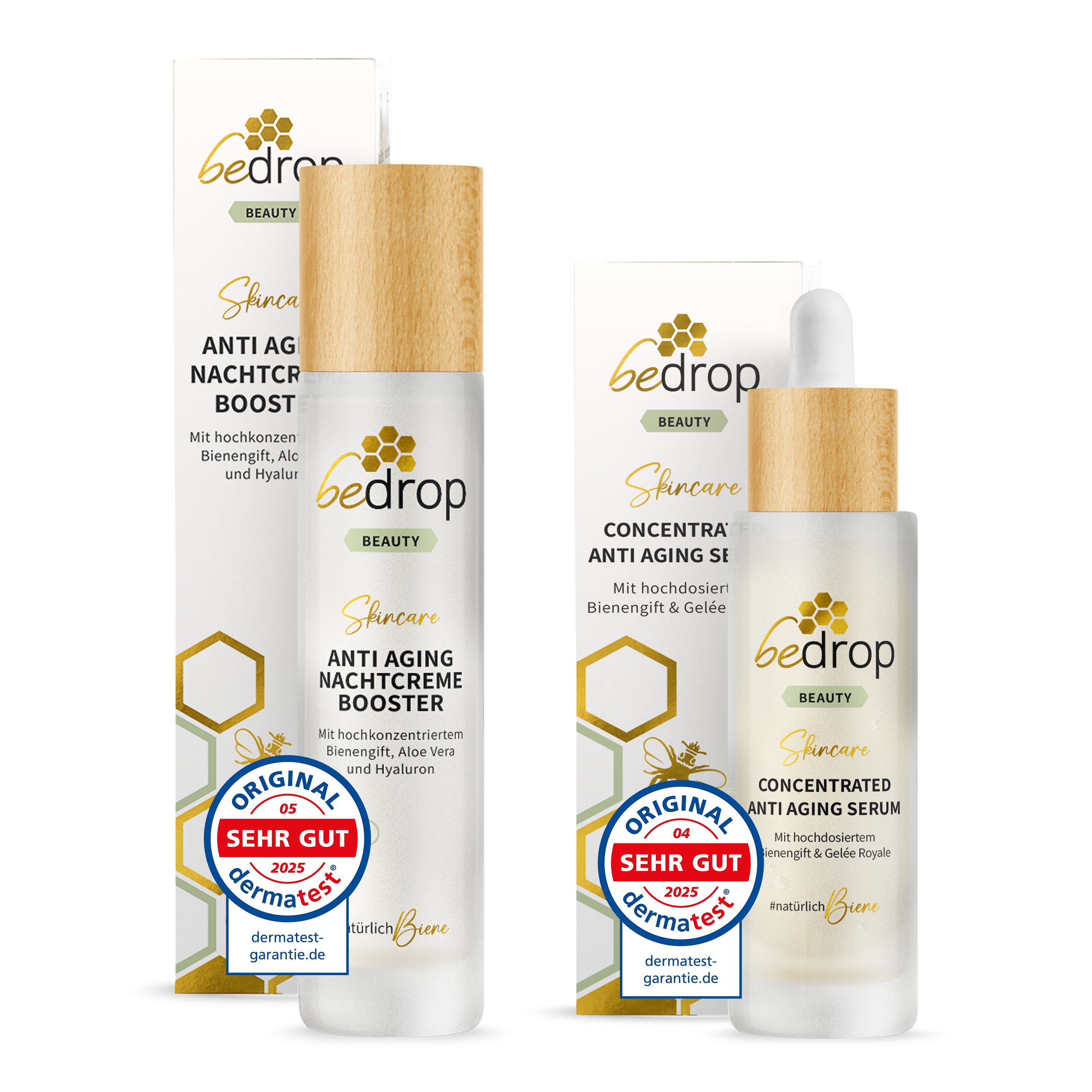 Inhaltsstoffe | Concentrated Anti Aging Serum: Aqua (Wasser), Pentylene Glycol (Pentylenglycol), Glycerin (Glycerin), Sodium Hyaluronate (Natriumhyaluronat), Xanthan Gum (Xanthan), Acetyl Glucosamine (Acetylglucosamin), Bee Venom (Bienengift), Calcium Pantothenate (Calciumpantothenat), Royal Jelly Powder (Gelée Royale-Pulver), Urea (Harnstoff), Adenosine (Adenosin), Sodium Citrate (Natriumcitrat), Citric Acid (Zitronensäure) Anti Aging Nachtcreme Booster: Aloe Barbadensis Leaf Juice (Aloe Vera), Aqua, Pentylene Glycol (Feuchtigkeitsspender), Isoamyl Laurate (Emollient), Glyceryl Stearate (Emulgator), Polyglceryl-6 Stearate (Emulgator), Butyrospermum Parkii Butter (Sheabutter), Hydrogenated Vegetable Oil (Pflanzenöl), Passiflora Incarnata Seed Oil (Passionsblumenöl), Coccaprylate/Caprate (Emollient), Octyldodecanol, Simmondsia Chinensis Seed Oil (Jojobaöl), Glycerin (Feuchthaltemittel), Sodium Stearoyl Glutamate (Emulgator), Xanthan Gum, Ascorbyl Glucoside (Vitamin C), Arginine (Aminosäure), Sodium Citrate (Natriumcitrat – pH-Regulator), Sodium Hyaluronate (Natriumhyaluronat – feuchtigkeitsspendend), Polyglceryl-6 Behenate (Emulgator), Tocopherol (Vitamin E), Bee Venom (Bienengift), Helianthus Annuus Seed Oil (Sonnenblumenöl), Citric Acid (Zitronensäure – pH-Regulator) |