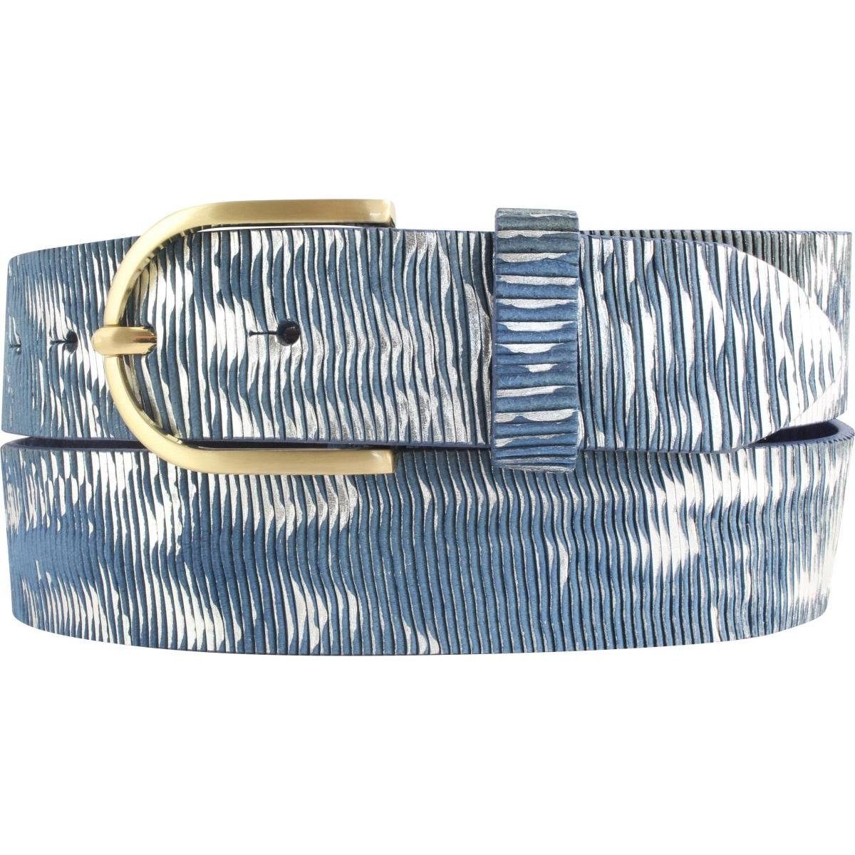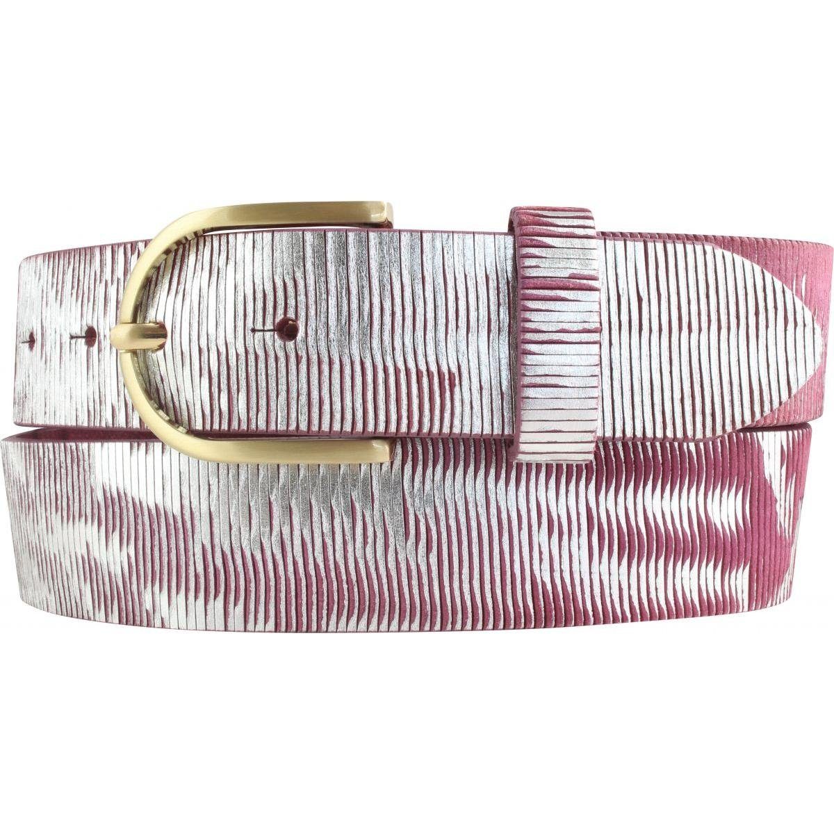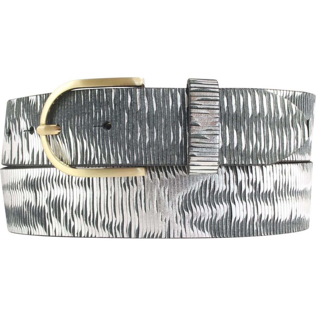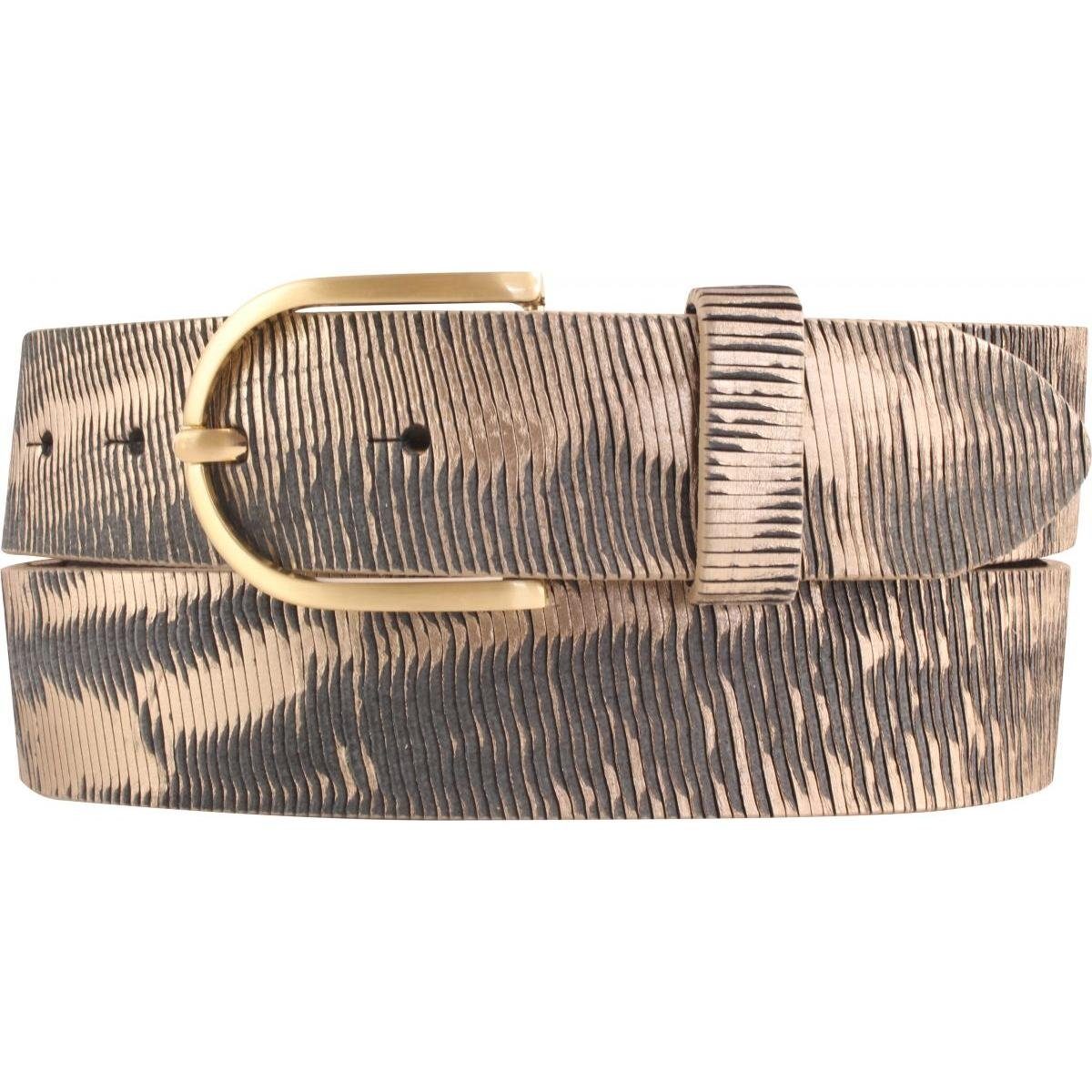 Dieser Ledergürtel mit Metalloptik in einer Breite von 4,0cm ist ein echter Blickfang. Die Kreation aus qualitativ hochwertigen Vollrindleder und individualisierter Prägung veredeln jedes Outfit. Die Oberfläche des Leders wird geritzt so dass ein metallisch-chargierende Muster entsteht. Der Gürtel aus echtem Leder kann von Damen sowohl auf dem Kleid oder der Hose als auch auf der Jeans oder Chino getragen werden - der perfekte Begleiter für jedes Event, das Büro oder als Freizeit-Accessoire. Die runde Dorn-Schließe aus Metall (Zamak) hat die Farbe Gold Matt.