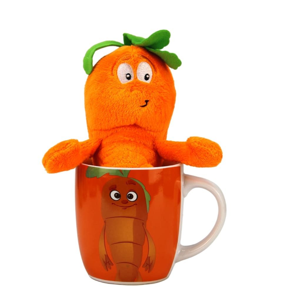 Niedliche Karotte als Kuscheltier: Die orangefarbene Plüsch-Karotte kombiniert ein kuscheliges Spielzeug mit einer praktischen Tasse.