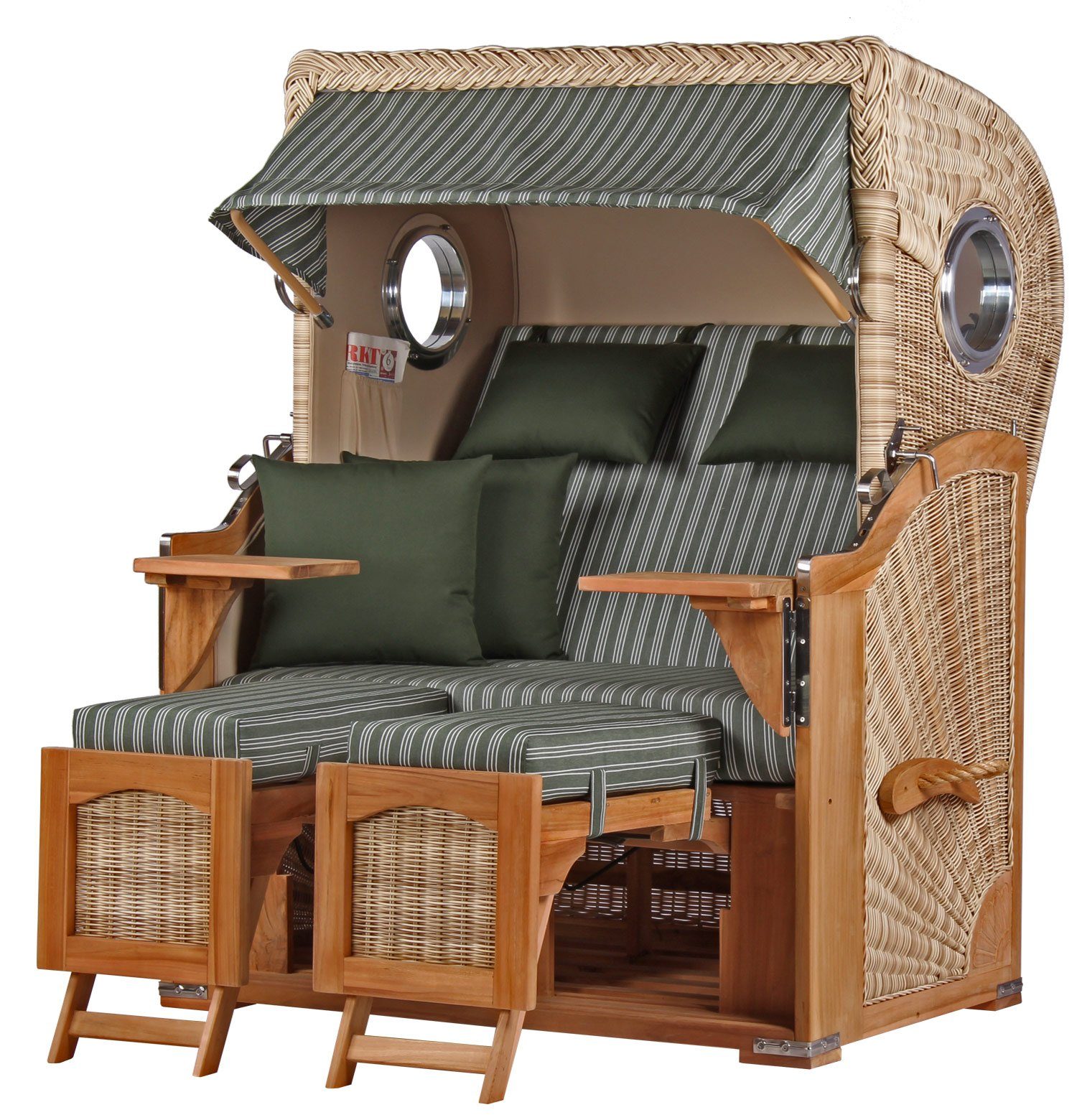 Der Strandkorb ermöglicht Ihnen dank seiner dicken Polsterung mit zwei Wurf- und Nackenkissen ein sehr bequemes Sitzen. Durch die Vollliegerfunktion und dem eingebauten Liftersystem lässt sich der Oberkorb mühelos um 175° nach hinten verstellen. Вперед überzeugt der Strandkorb durch die ausziehbaren Fußstützen, die mit einer extra dicken Fußpolsterung versehen sind. Zwei schwenkbare Bistrotische bieten Platz für ein Getränk und in den praktischen Zeitungstaschen findet Ihre Strandkorb-Lektüre Platz.